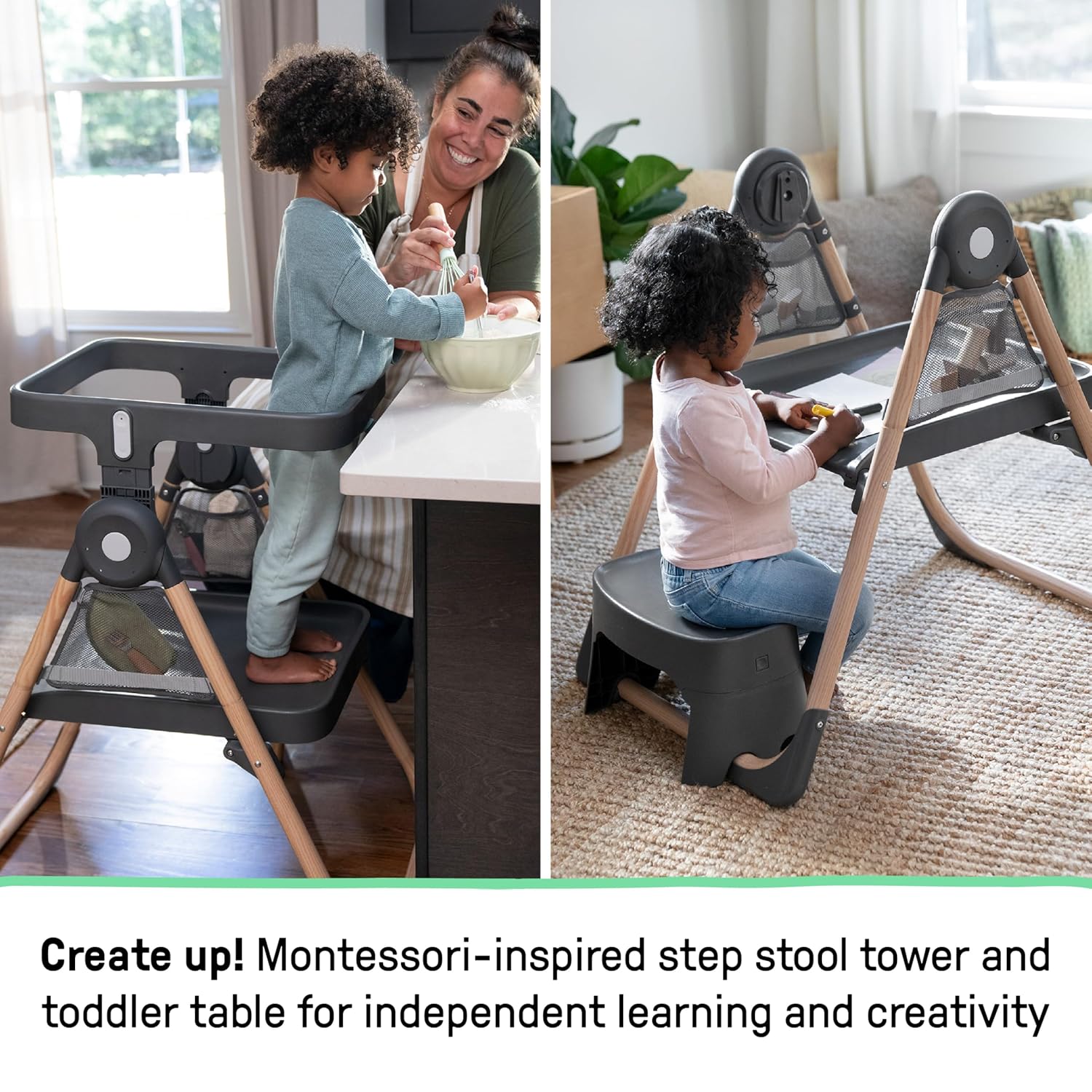 Your little one will grow but their messes don’t have to. With the Proper Positioner Create Up! High Chair, their favorite high-chair can convert into the perfect tower and activity desk. With 9 modes of individual use, your little one can enjoy this high chair immediately as a full-tilt recling seat great for bottle feeding, removable rocking infant seat, full-size high chair, up-to-table seat, chair top high chair, toddler stool, toddler booster. And the multi-use doesn’t stop there – this high chair easily converts into a counter-height learning/kitchen tower, and an activity creative station. So your little one can enjoy this as a high chair during their earliest meals and as an activity desk to create their greatest mini masterpieces. Has your household grown? This high-chair can cater to two kids at once in 6 different ways when you use as a rocker, desk, tower, and/or chair topper. For your infant, 90-90-90 ergonomic design and adjustable footrest helps baby keep their ankles, knees, and hips at the right position for better digestion throughout mealtime. Plus, a 5 point safety harness keeps them secure. As your infant grows, you’ll both continue to enjoy features from this high chair including a 3 position tray with a dishwasher-safe insert and a platform under the seat for storage. As a toddler, they can keep their favorite toys and activities for easy access whenever they’re ready to play in the activity desk’s convenient storage pockets. Plus, it includes a removable bench for an additional seating option. From hungry newborns to creative toddlers to kitchen helpers, this is the perfect all-in-one solution for parents looking to save space while giving their child plenty of options for mealtime and play spaces.