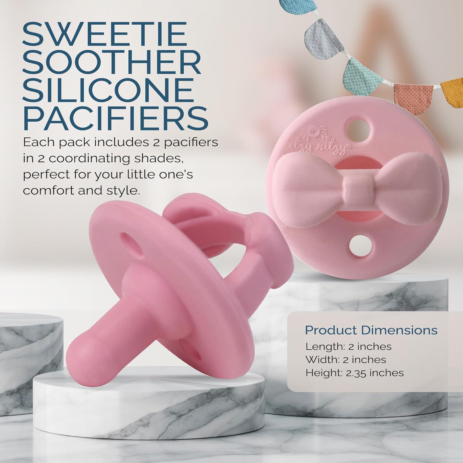 Discover Itzy Ritzy’s 100% food grade silicone pacifiers, an excellent choice for your baby’s comfort and safety. Crafted with premium silicone and certified to meet strict ASTM standards, this 2-pack of pacifiers features a soft and durable nipple shape ideal for newborns. The adorable bow detail on the collapsible handle adds a touch of style to your baby’s outfits, and the two airholes ensure your little one’s safety. Make Itzy Ritzy pacifiers a must-have in your newborn essentials, offering both comfort and peace of mind.