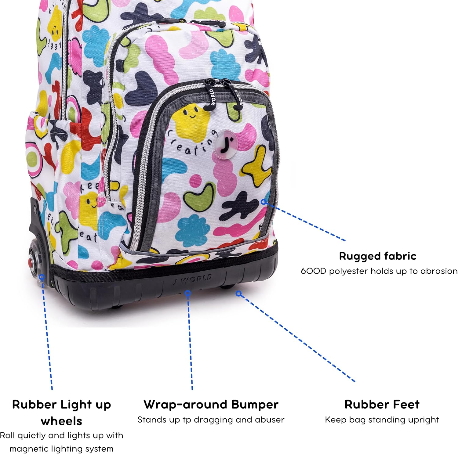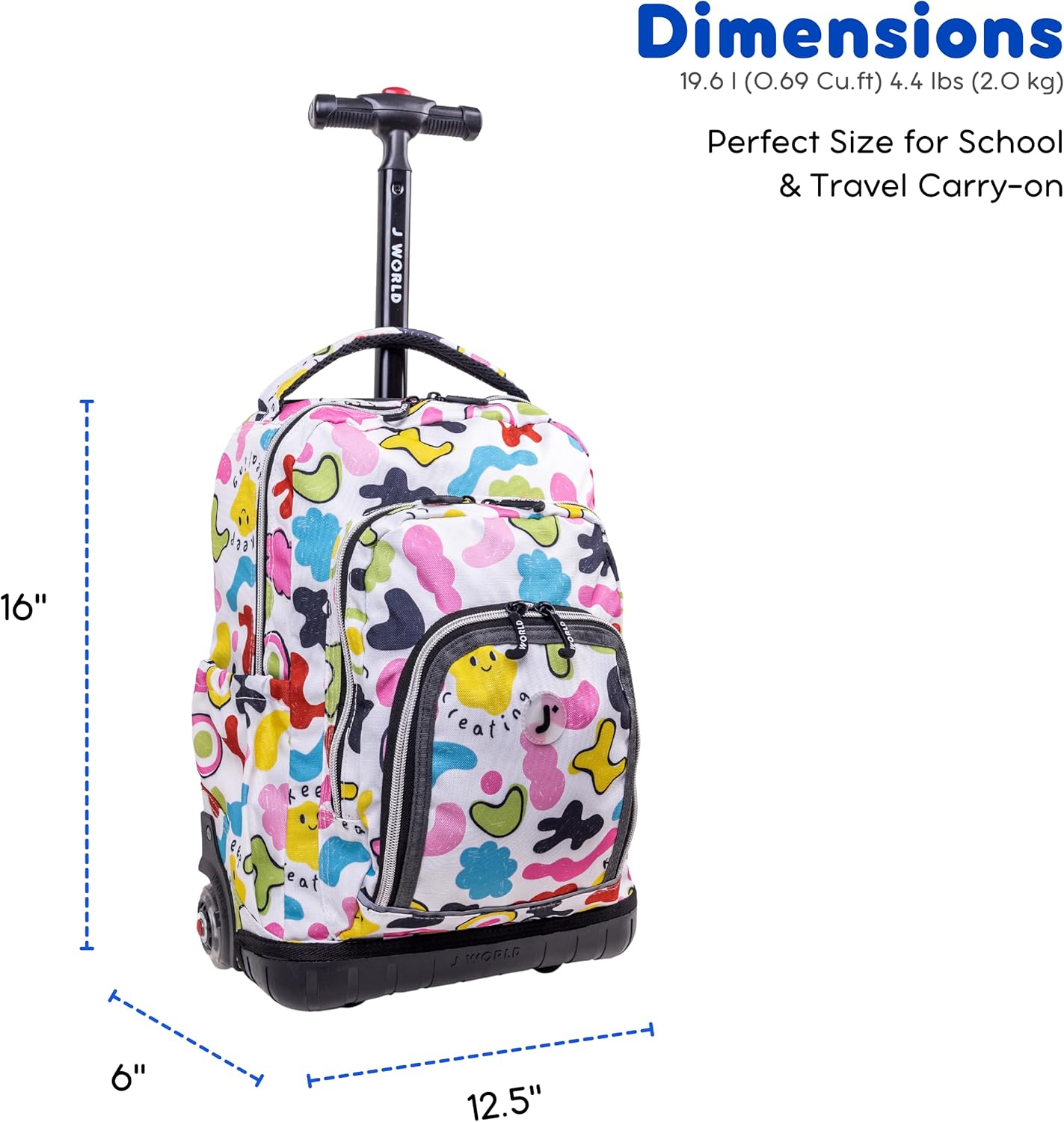 The Sunny rolling backpack includes a matching insulated lunch bag. The rolling backpack functions as both a bag on wheels for school and a fun carry-on backpack for kids age 3 years and up. The roller backpack has a main zippered compartment, 2 exterior zipper pockets and 2 side pockets, plus an internal organizer with key clip, pen slots and pouches for small items. This bag is small enough for kids in Pre-K to 3rd grade to pull—it measures 16 x 12 x 8 inches—yet fits lunch, books and a jacket. The adjustable aluminum luggage handle extends to 26 or 31 inches to be easily pulled by preschoolers and kids 36 to 52 inches tall. To convert into a wearable backpack, just pull-out backpack straps in seconds. When rolling, straps easily tuck away in slot on roller backpack—no having to unzip. Motion-activated LED light-up backpack wheels blink as they turn (No batteries required!) Wheeled backpack rolls and turn effortlessly on sidewalks and paths. This pre-K backpack features a metal frame and a molded bumper to protect against abrasion. Kids backpack and lunch box set is made of durable ripstop polyester fabric. The matching insulated lunch bag keeps food at the right temperature. Holds a sandwich, drink, snack, and ice pack. Measures 10 x 8 x 4 inches. At J World, we stand behind our products 100%. If you have any issues with this rolling backpack for girls and boys, we will make things right.