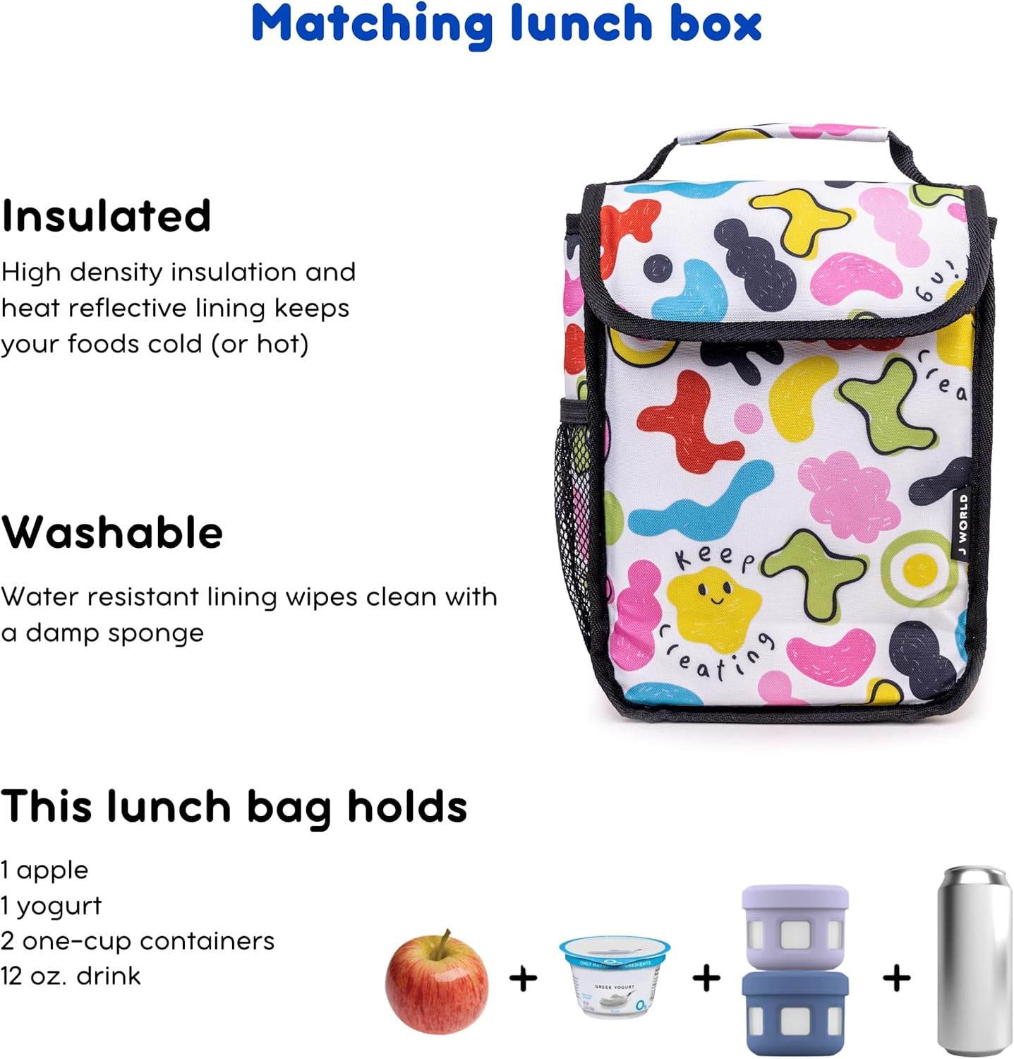 Insulated Lunch Bag — Included lunch bag for kids keeps food at the right temperature. Holds a sandwich, drink, snack, and ice pack. Measures 10 x 8 x 4 inches