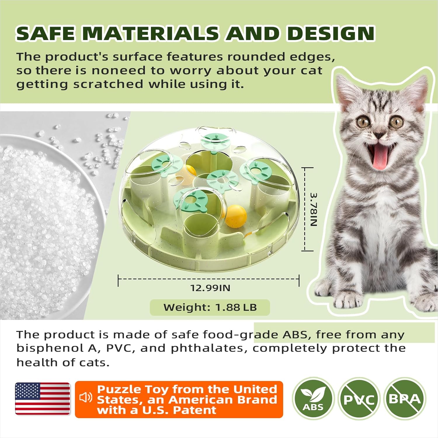 [Safe Materials and Design]The main body of the toy is made from food-grade ABS, which is highly enduring and free from any Bisphenol A (BPA), PVC, or phthalates. The product’s surface features rounded edges, ensuring that your cat will not get scratched while playing with the toy. Both the raw materials and the finished product are extremely safe, so you can confidently allow your cat to use it.