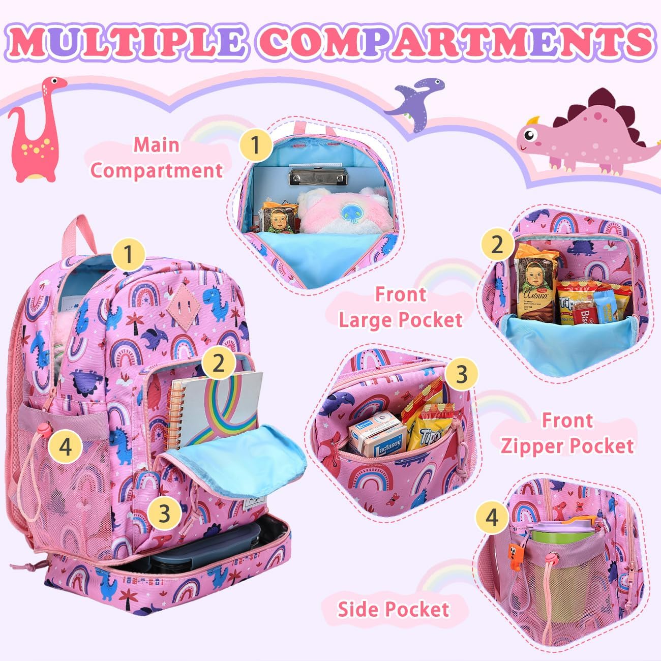 MULTIPLE COMPARTMENTS:27x17x40cm/10.6×6.6×15.7inch (LxWxH), lunch compartment: 28x18cm/11×7.1inch. Capacity:18L.The main compartment with with separate tablet sleeve and built-in a name tag,can holds A4 files, textbooks, and pencil case.Two front pockets provide storage for snacks or small items. Flexible elastic side pockets provide ample space for water bottle and umbrella.