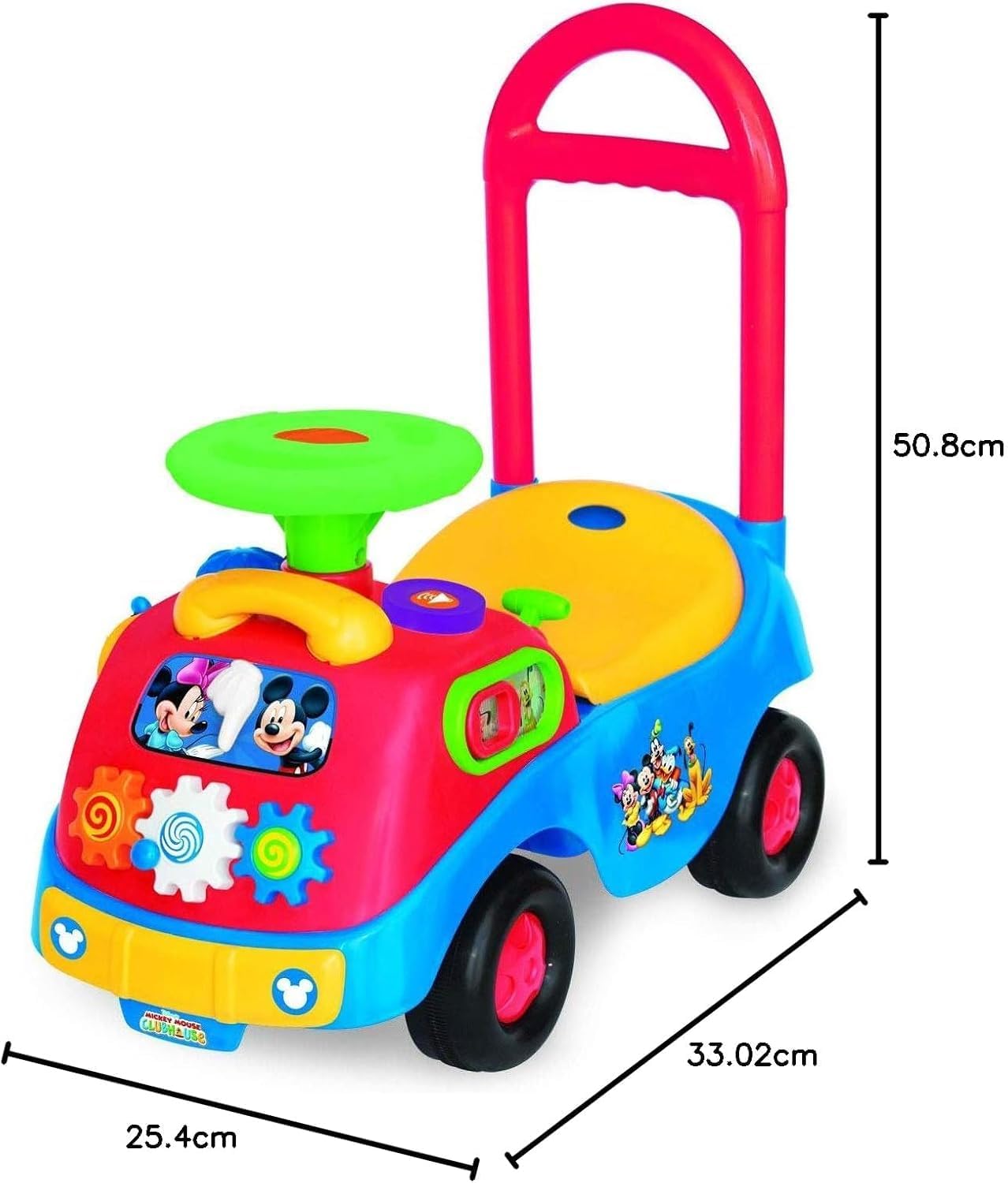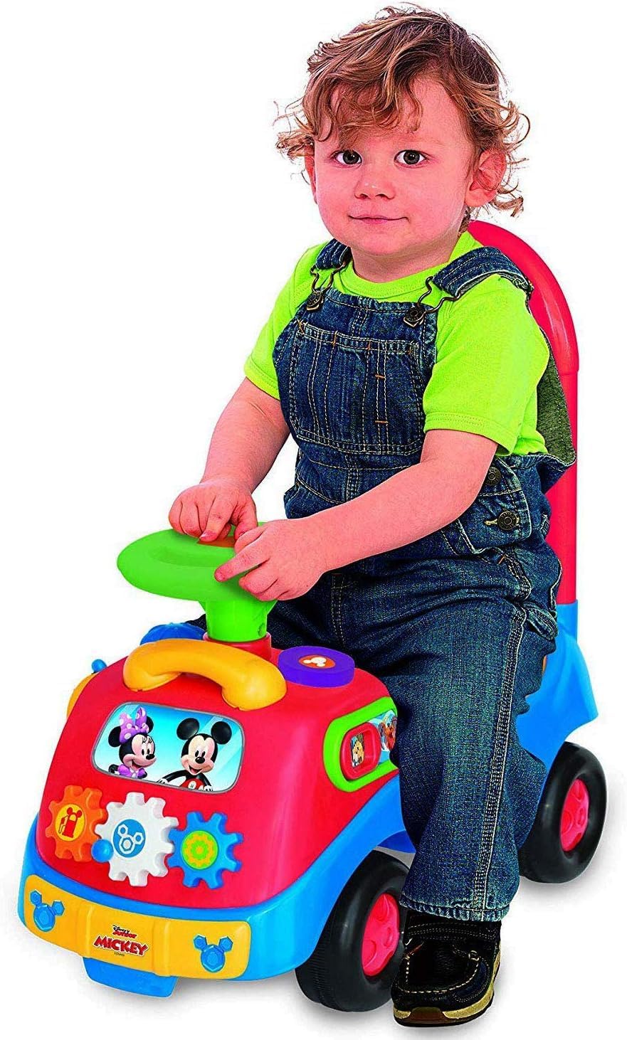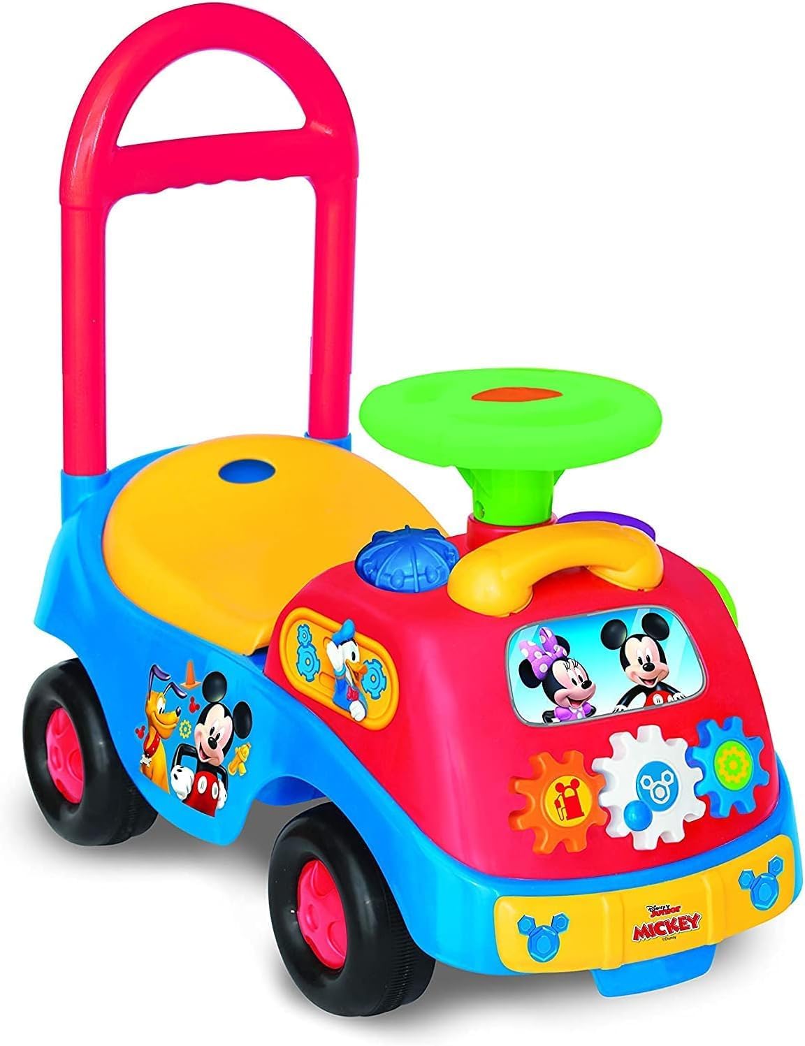 The Disney Mickey and Friends Activity Gears Ride-On is great for tots on the go. Listen to Mickey play his favorite music and songs. Slide Donald for fun sounds. Knob moves for colors and flashing lights. Comes with toy phone. Turn key and shift gears for engine sound. Honk horn and steer wheel for active fun. Uses 2 AA Batteries. For 12-36 Months.