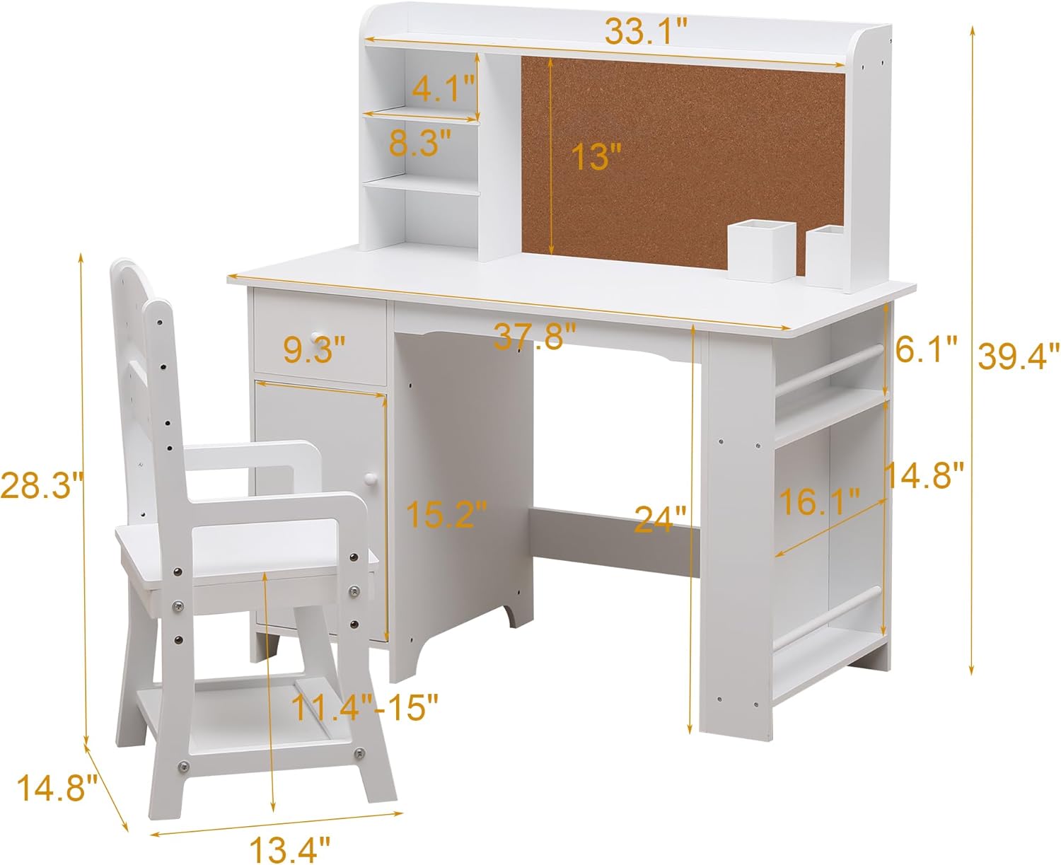 Kids Desk and Chair Set, Wooden Study Table with Storage Shelf, Bulletin Board, Children School Learning Desk Set, Writing Table for Boys and Girls, White