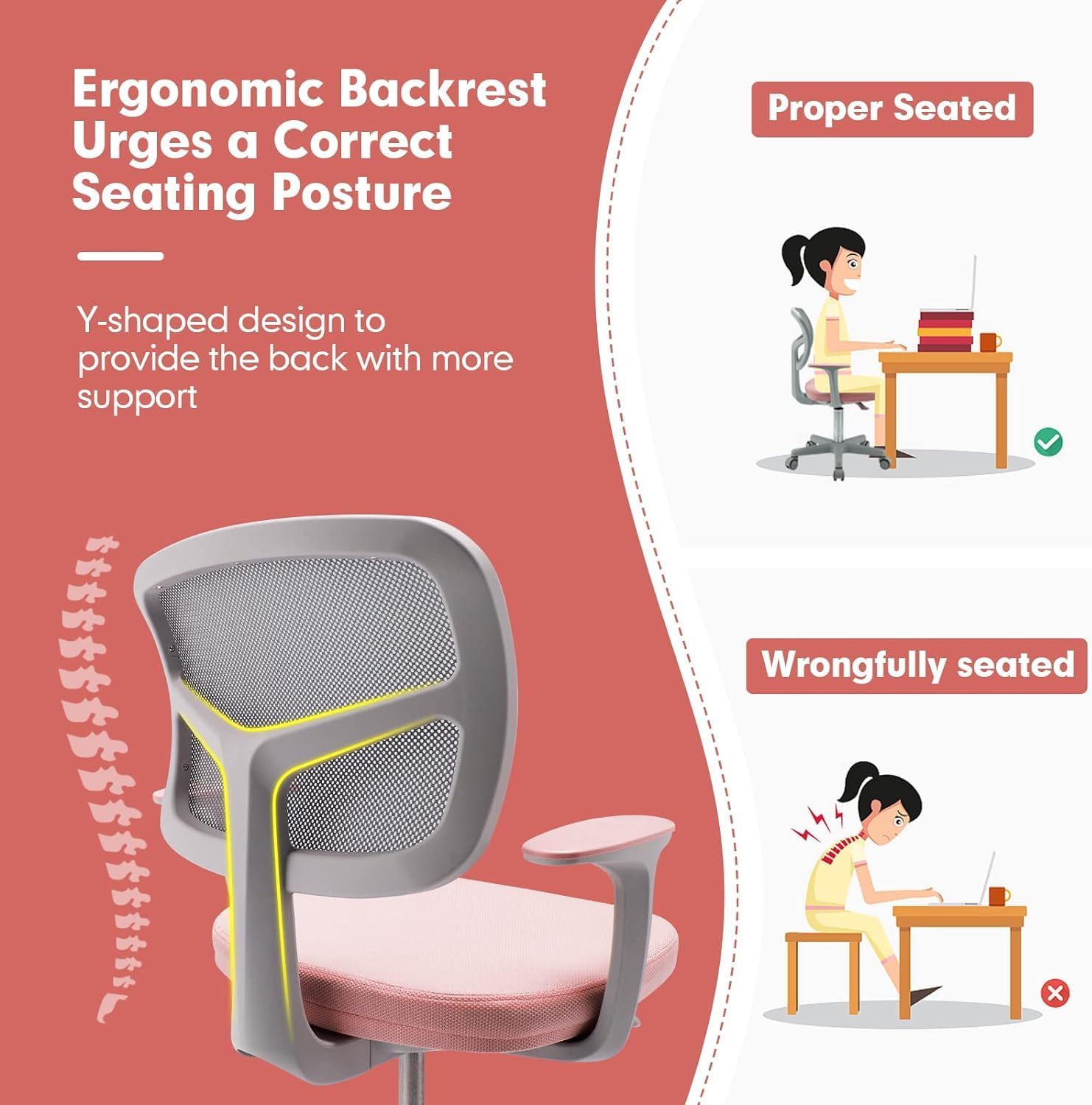 【Adjustable Height & Ergonomic Design】Our Kids Desk Chair features a height adjustable seat that can be easily adjusted between 16″ and 21″, ensuring that it can accommodate children of different heights. The ergonomic design includes a Y-shaped lumbar support, backrest, and armrests, providing optimal support for the back, waist, and arms. This promotes better posture and comfort, even during long study or work sessions.