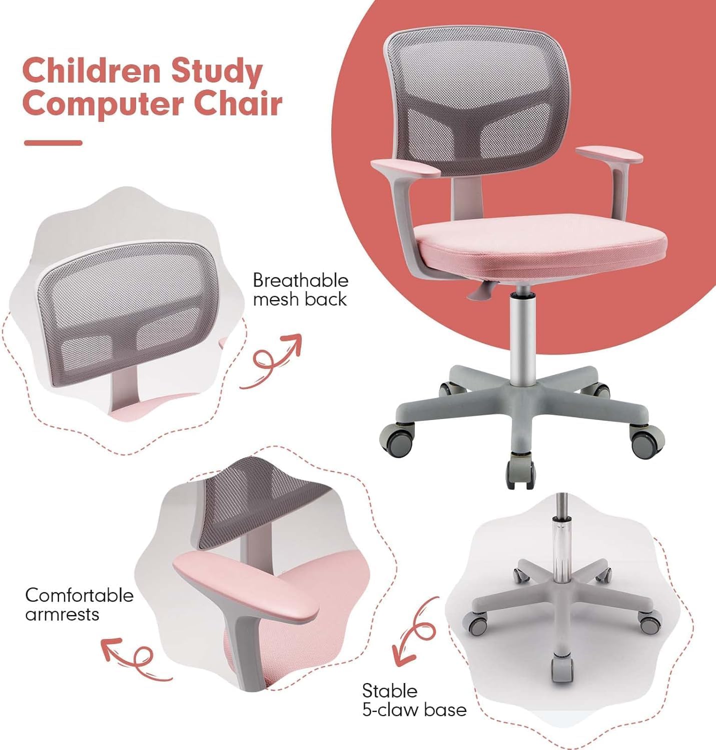 Kids Desk Chair, Height Adjustable Children Study Chair w/Lumbar Support, Swivel Mesh Seat, Universal Casters, Ergonomic Kids Task Chair for Boys Girls Aged 3-10, Home, School, Office (Pink)
