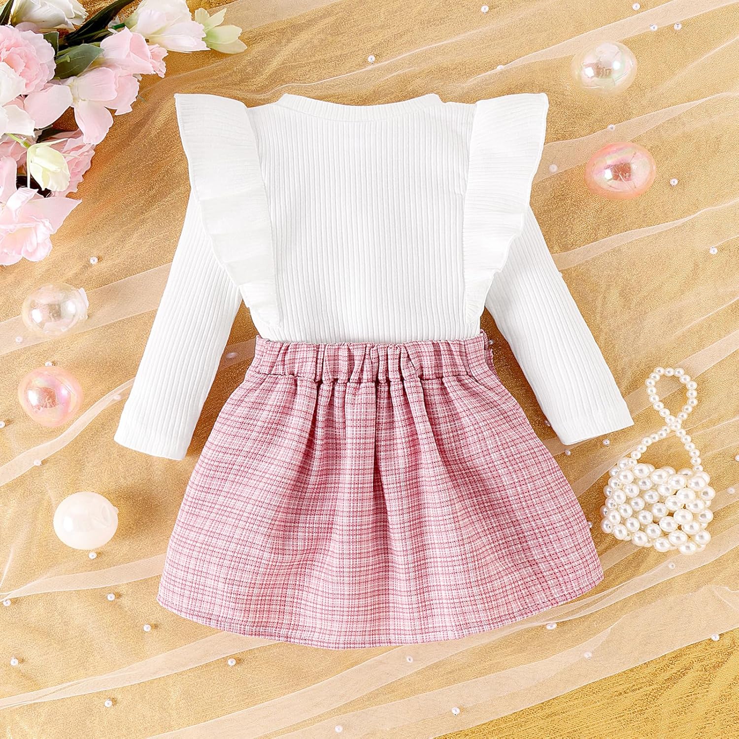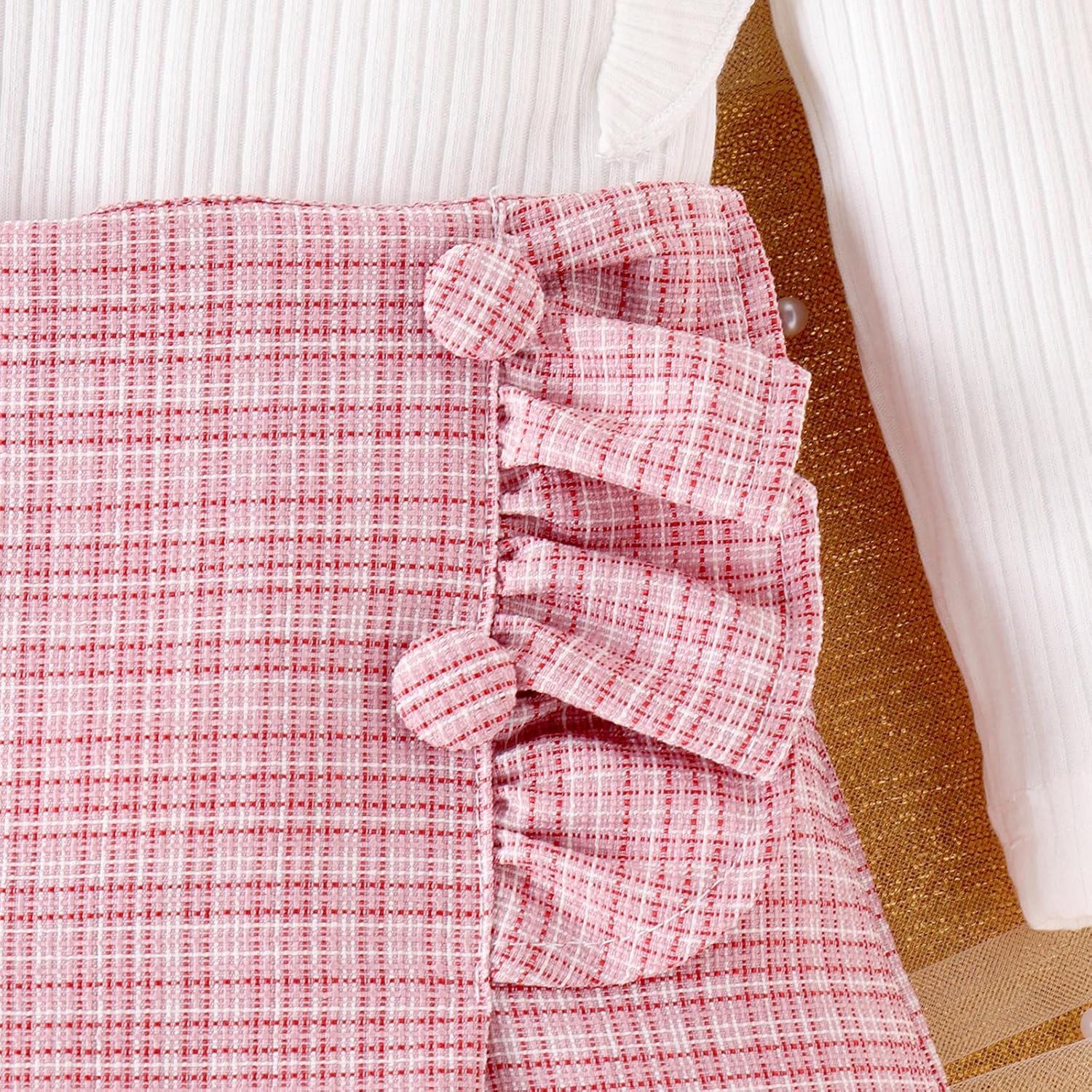 Girls Autumn 2PCS Skirt Outfits Long Sleeve Ruffle Ribbed Tops A-line Plaid Skirt Set