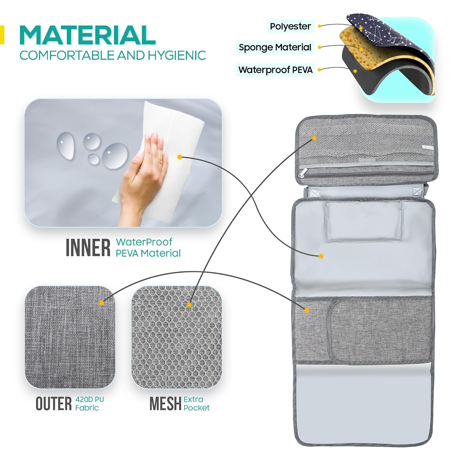 ✅ Premium Quality ➤ Best portable diaper changing pad for baby is stitched of top-notch, odor-free waterproof PEVA & polyester material to ensure a sanitary area for your baby. Additionally, the surface can be easily cleaned by hand.