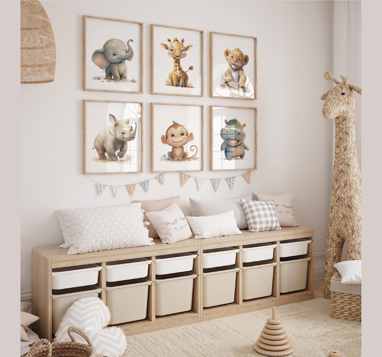 These cute animal pictures are designed and coordinated for baby rooms and children’s rooms in light natural tones, neutral colors, gray and beige colors. Baby room idea – Create a friendly and cozy room for children with these cute Africa safari animal posters. These unique happy baby animal motifs will make you and your children smile.