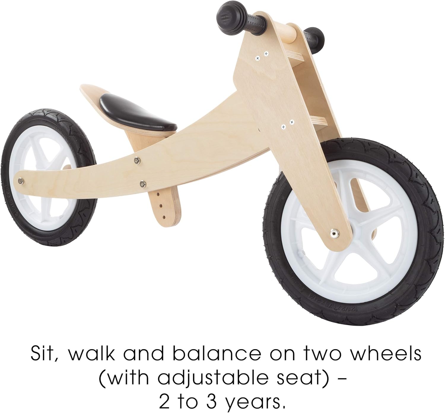 STURDY CONTSTRUCTION – This 3-in-1 beginner bike is made of a sturdy and durable wood frame with easy grip rubber handles and rubber wheels, making it rugged enough to handle both indoor and outdoor play. The seat is adjustable to suit kids of all sizes.