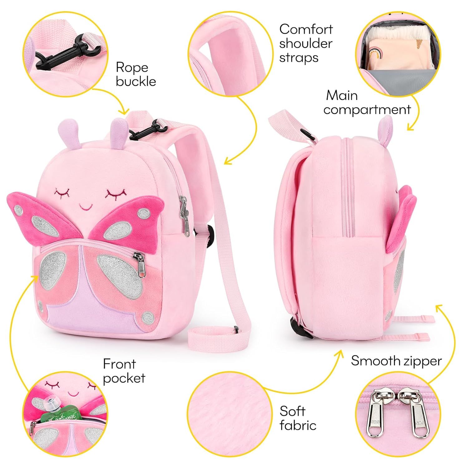 【DIMENSION】 This toddler girl backpack measures 8 x 3.5 x 10 inches. It’s the perfect size for kids ages 1~3 years to go to preschool or travel.