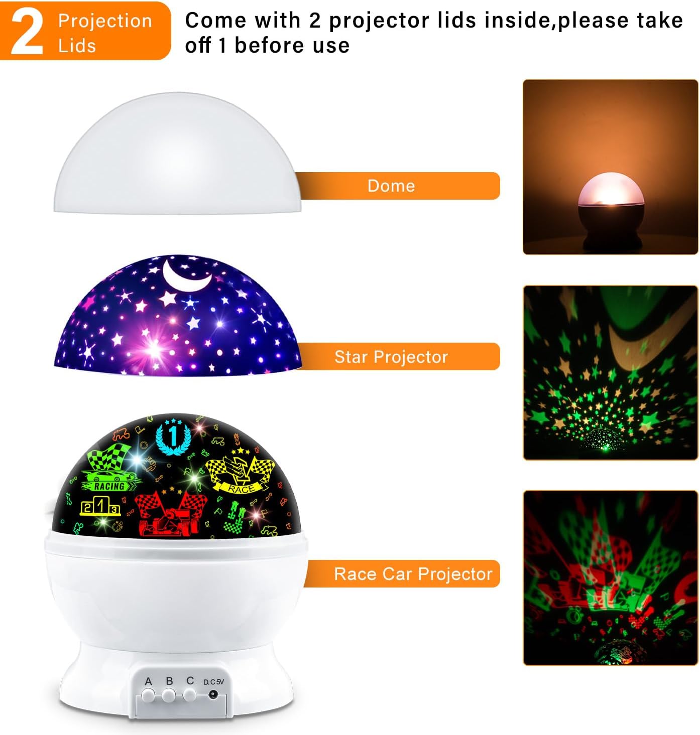 BIRTHDAY PROJECTOR LIGHTS INDOOR: Night lights projector come with 2 Lids for race car and starry sky, easy to change the patterns films lenses which is equivalent to buying two lamps with different projections for the price of one lamp. And it is very easy to control, There are 3 button , Press A for Warm Light Model, Press B for Color Light Change Model, Press C for Rotation Model
