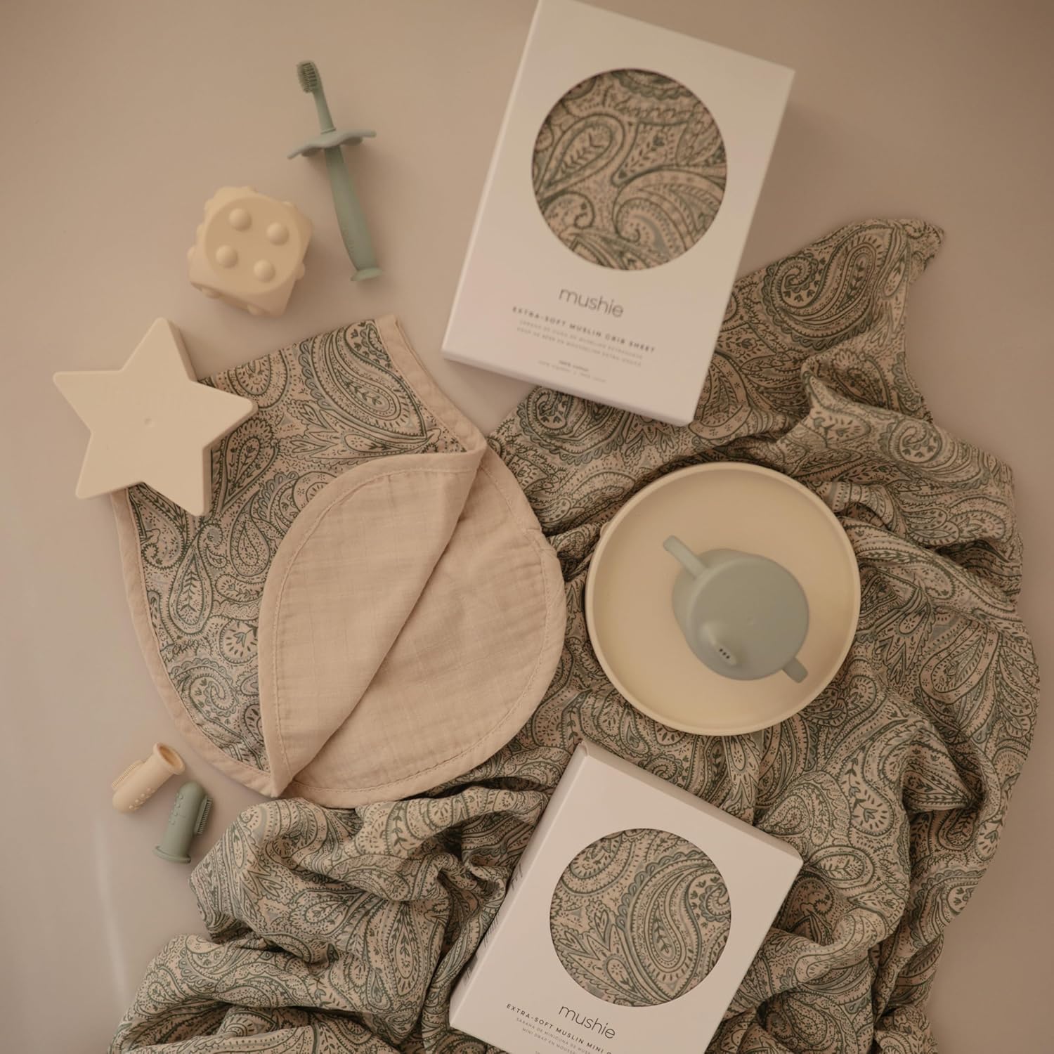 mushie Muslin Baby Burp Cloths | 100% Organic Cotton, Set of 2 (Green Paisley/Fog)
