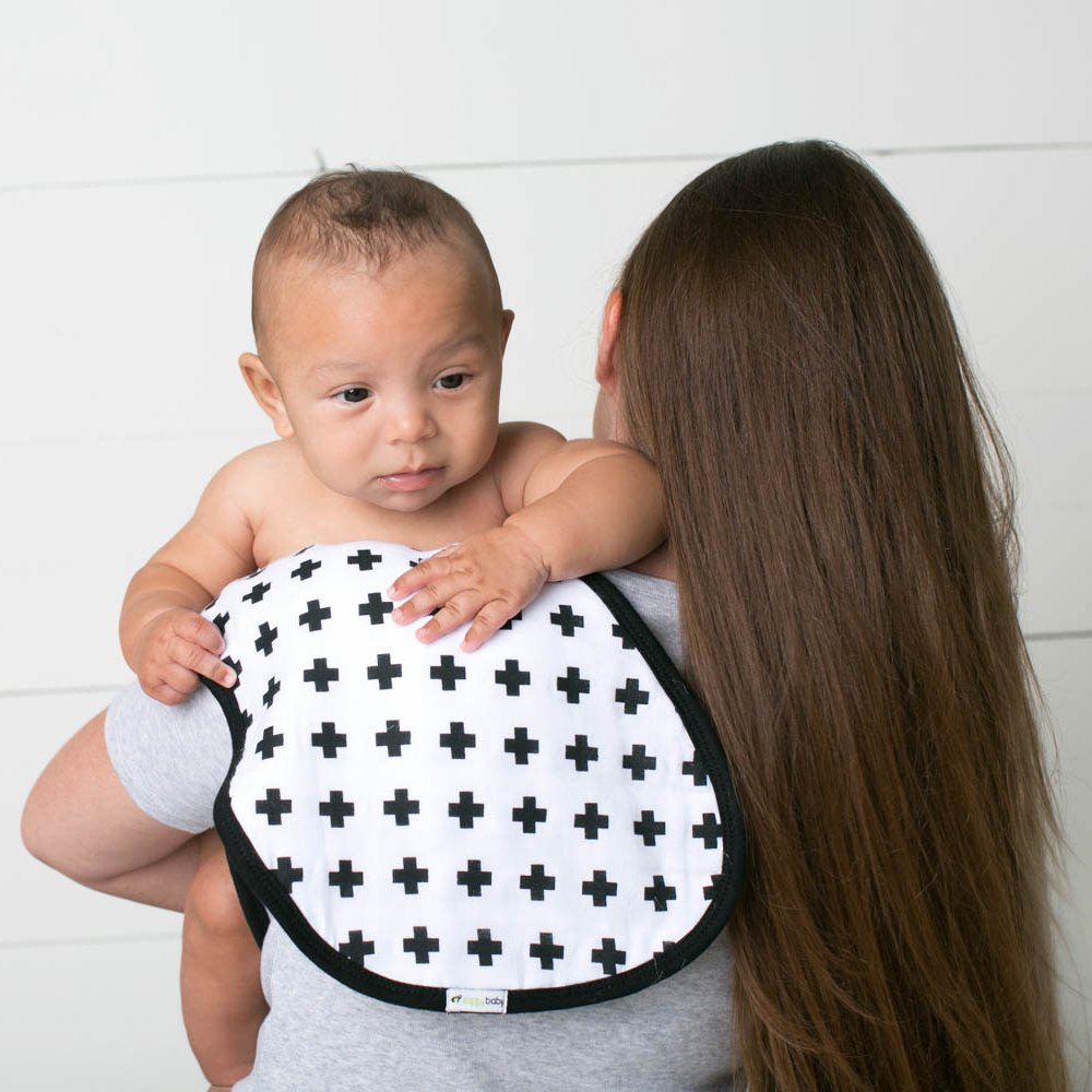 Made of 100% high quality muslin cotton in a stylish Grey and White Chevron, Arrow, Cross pattern, our Neutral Grey Collection baby burp cloths easily transform into baby bibs with a simple snap. The functional 24 x 9.5 inch burpy clothes provide generous coverage for newborns, infants, large babies, and even toddlers so you can get years of use without peeling or fraying. With a trendy & stylish design, our burp cloth set has a contoured shape to fit comfortably over your shoulder while the absorbent, 4-ply muslin cotton protects your clothes from baby drool and spit up. These versatile, unisex baby cloth bibs and burp cloths make the perfect boy, girl baby shower gift.