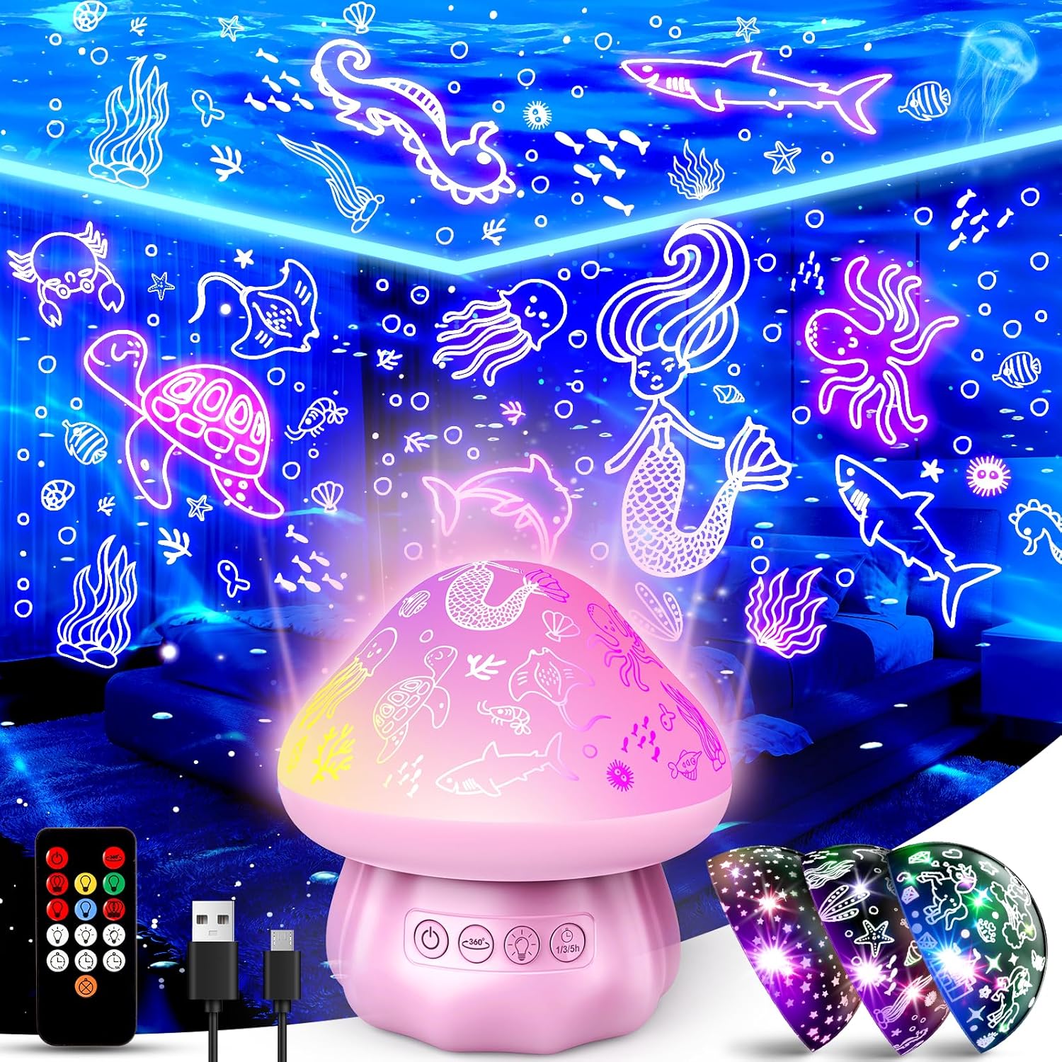 4 In 1 Night Light Projector: Our night light projector with 3 films,star moon night light,unicorns night lights, and sea night light. Covered with a dome cover the starlight projector also can be used as a nightlight. Our night light projector can project clear images and starry landscapes can create a safe and comfortable sleeping environment for baby, as a nightlight, kids can take it anywhere which can provide the warm light for kids to walk through the hallway