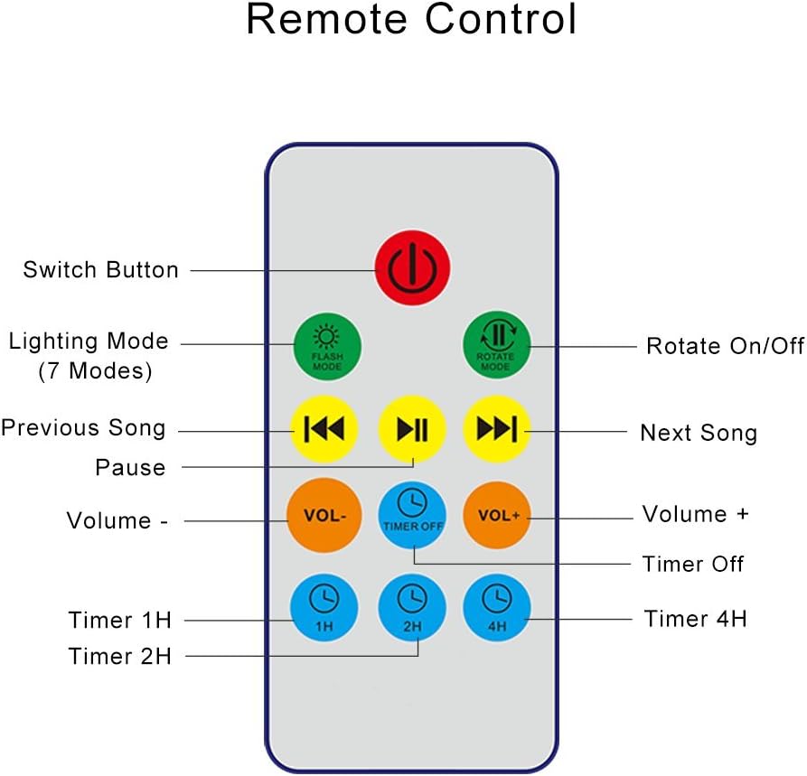 The night light projector with remote controller and touch senor keys,It is very convenient for you to turn on/off the lamp,change lighting mode,adjust the volume or set automatic off timer.