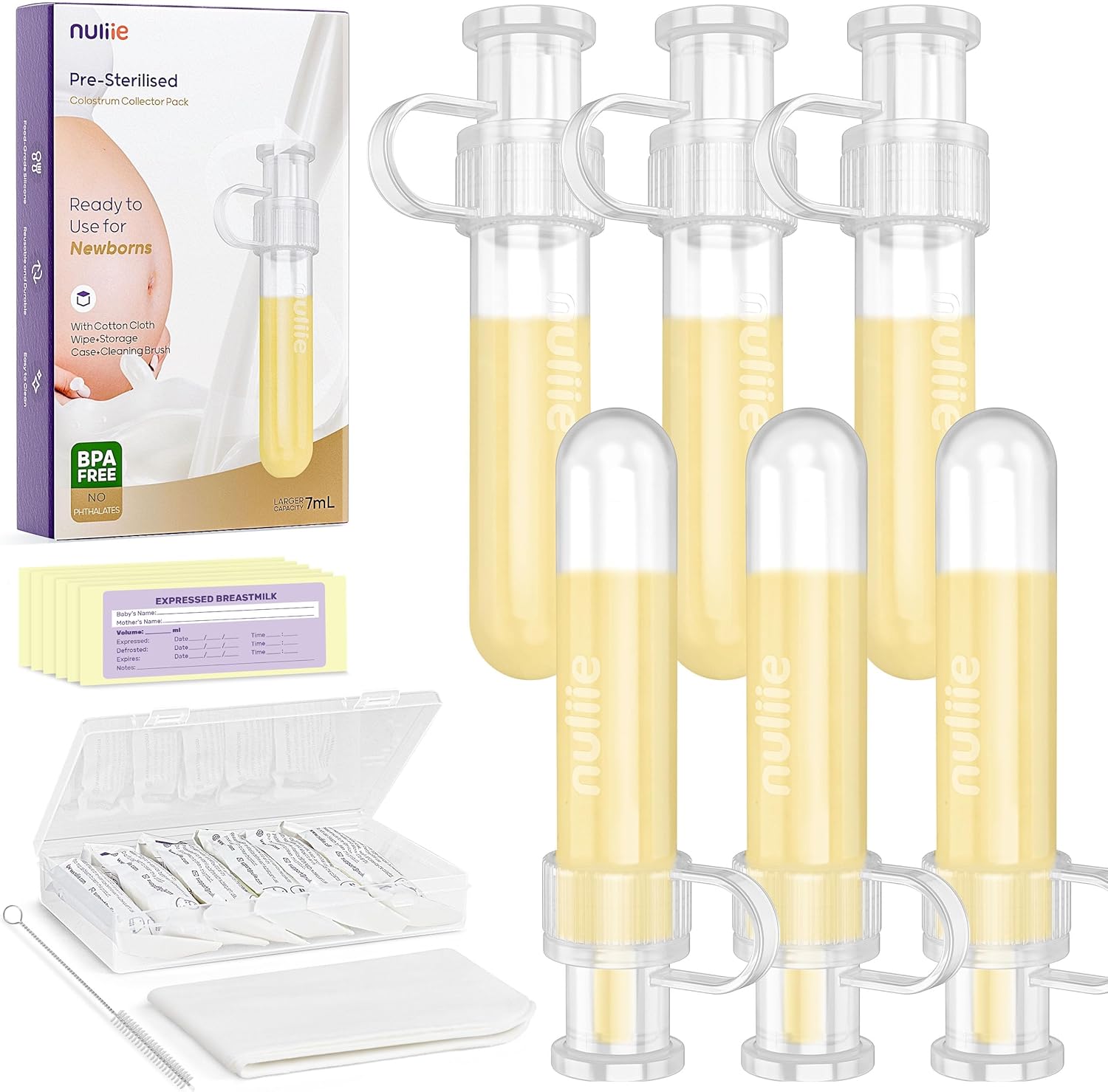 What Will You Get in The Package: The Nuliie colostrum collector kit 6-piece set includes six 7ml/0.24oz silicone collectors (ready-to-use sealed packaging), six labels, one cleaning cloth, one portable storage box, and one cleaning brush.