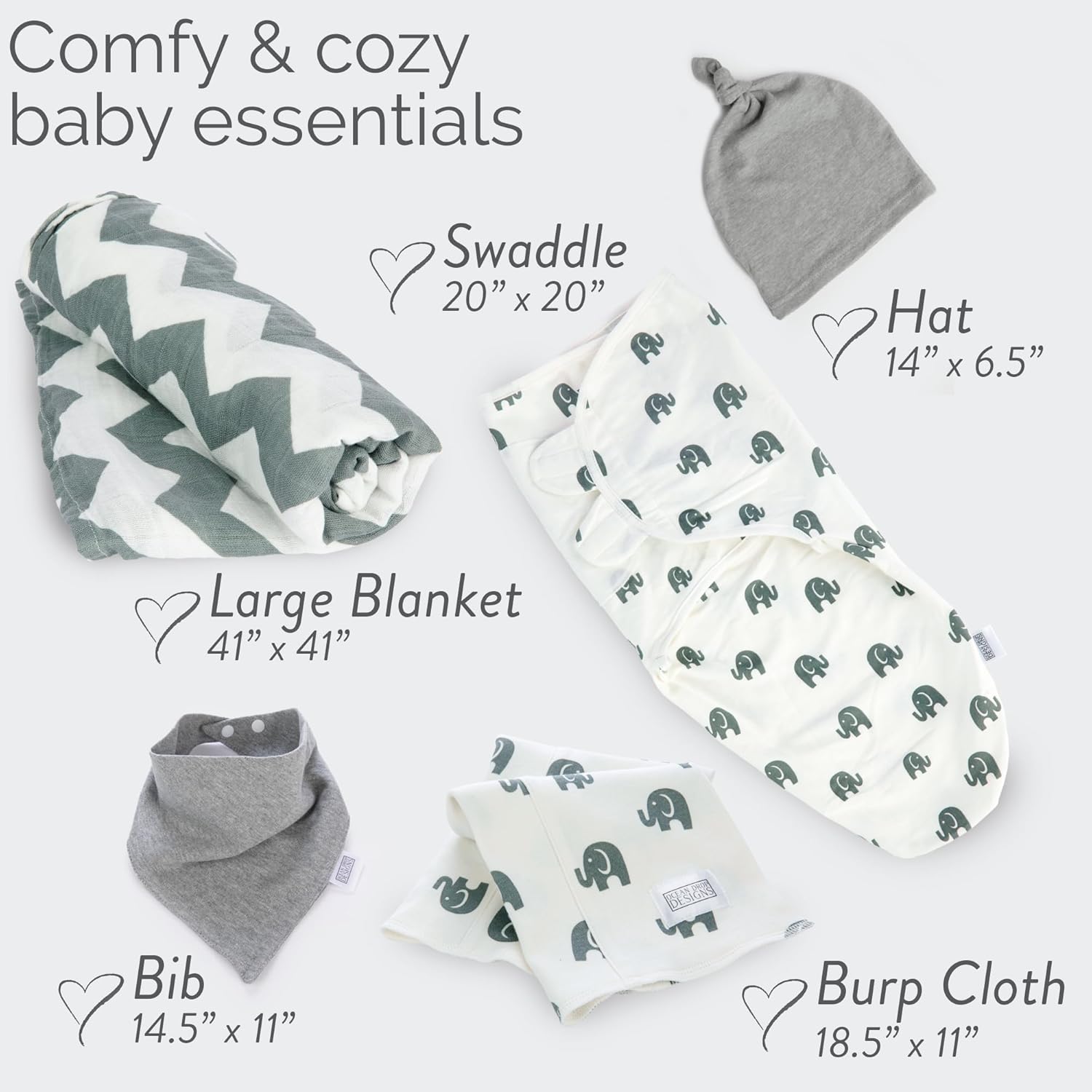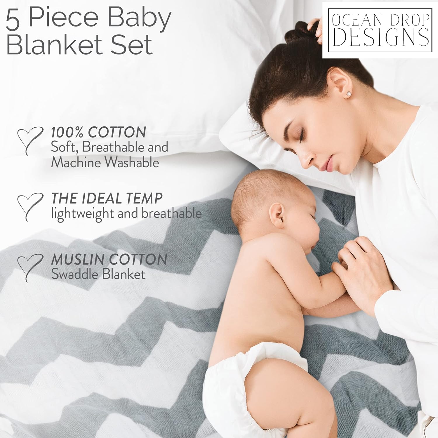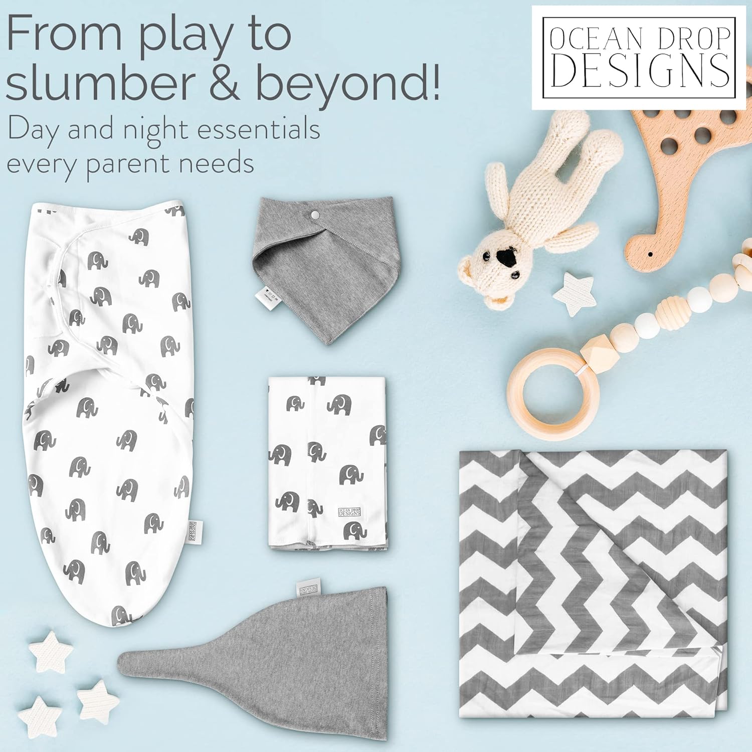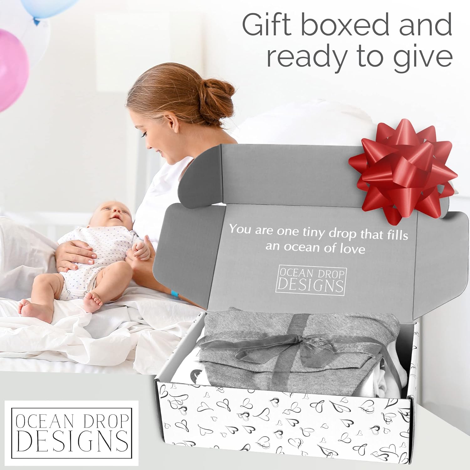 NEWBORN ESSENTIAL MUST HAVES: 100% Cotton machine washable newborn gift set comes in either blue, pink, or grey. Perfect fit for newborns (0-3 MONTHS). The Ocean Drop 5pc set has a 100% cotton swaddle, hat, bib, burp cloth, and muslin blanket in a gift box. Perfect for baby showers or new parents.