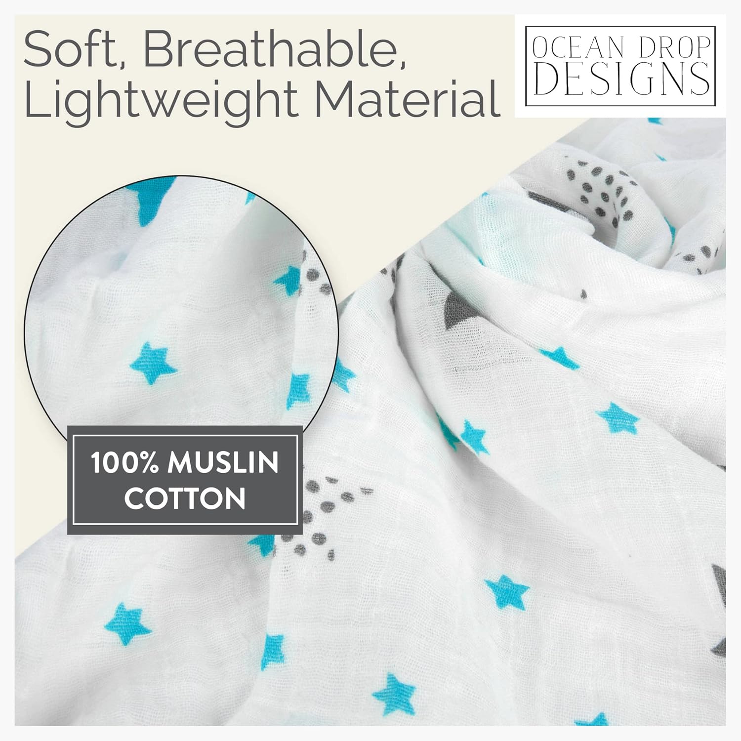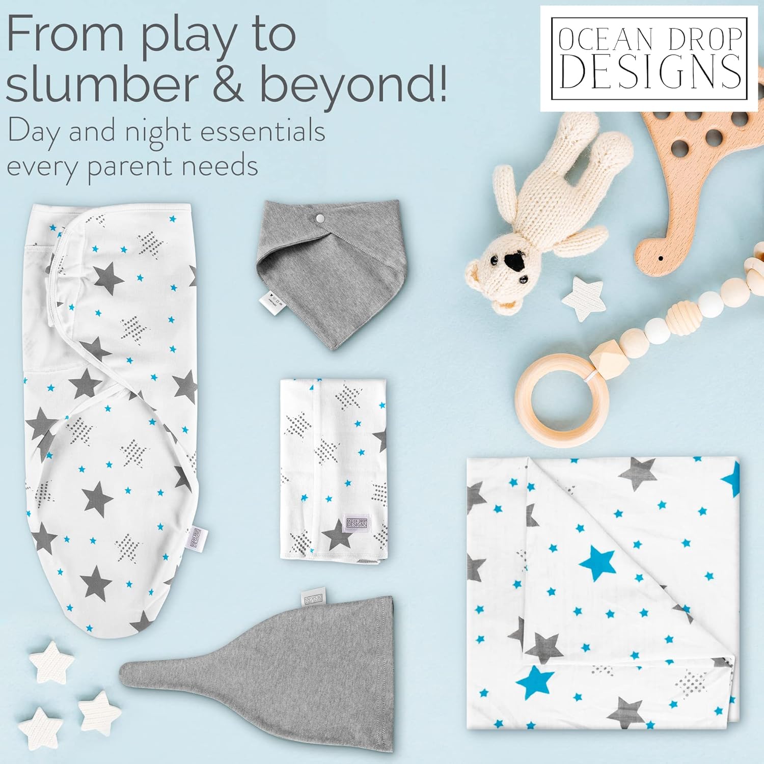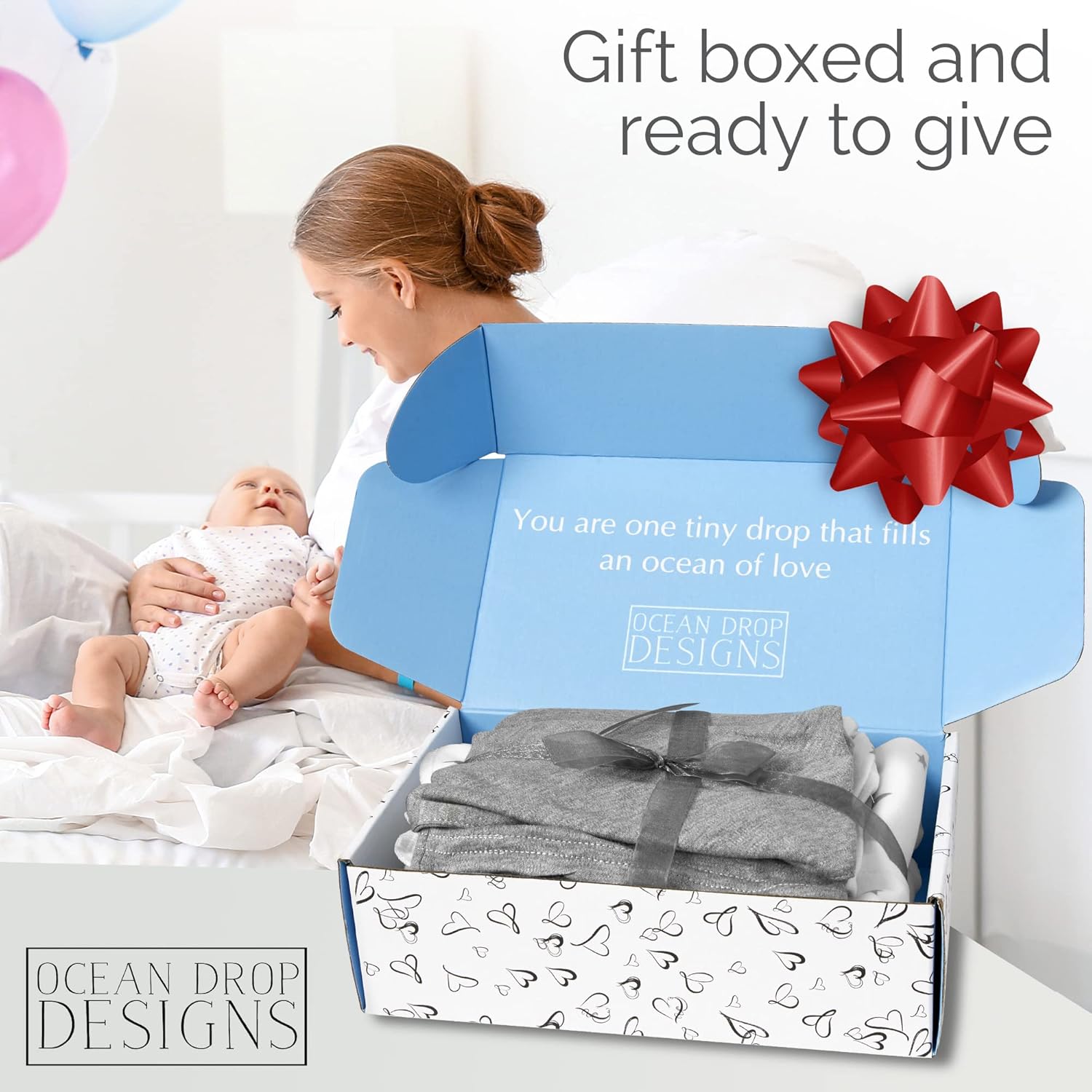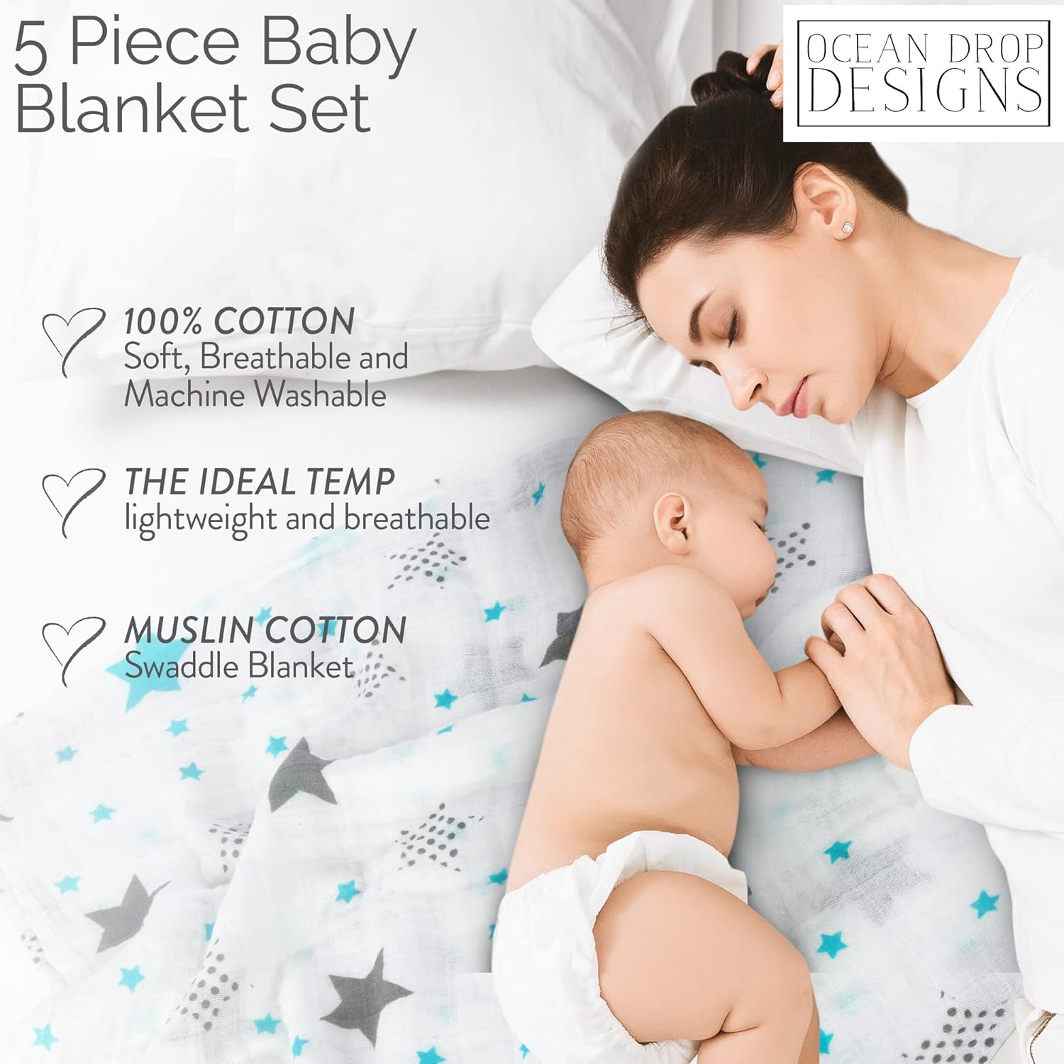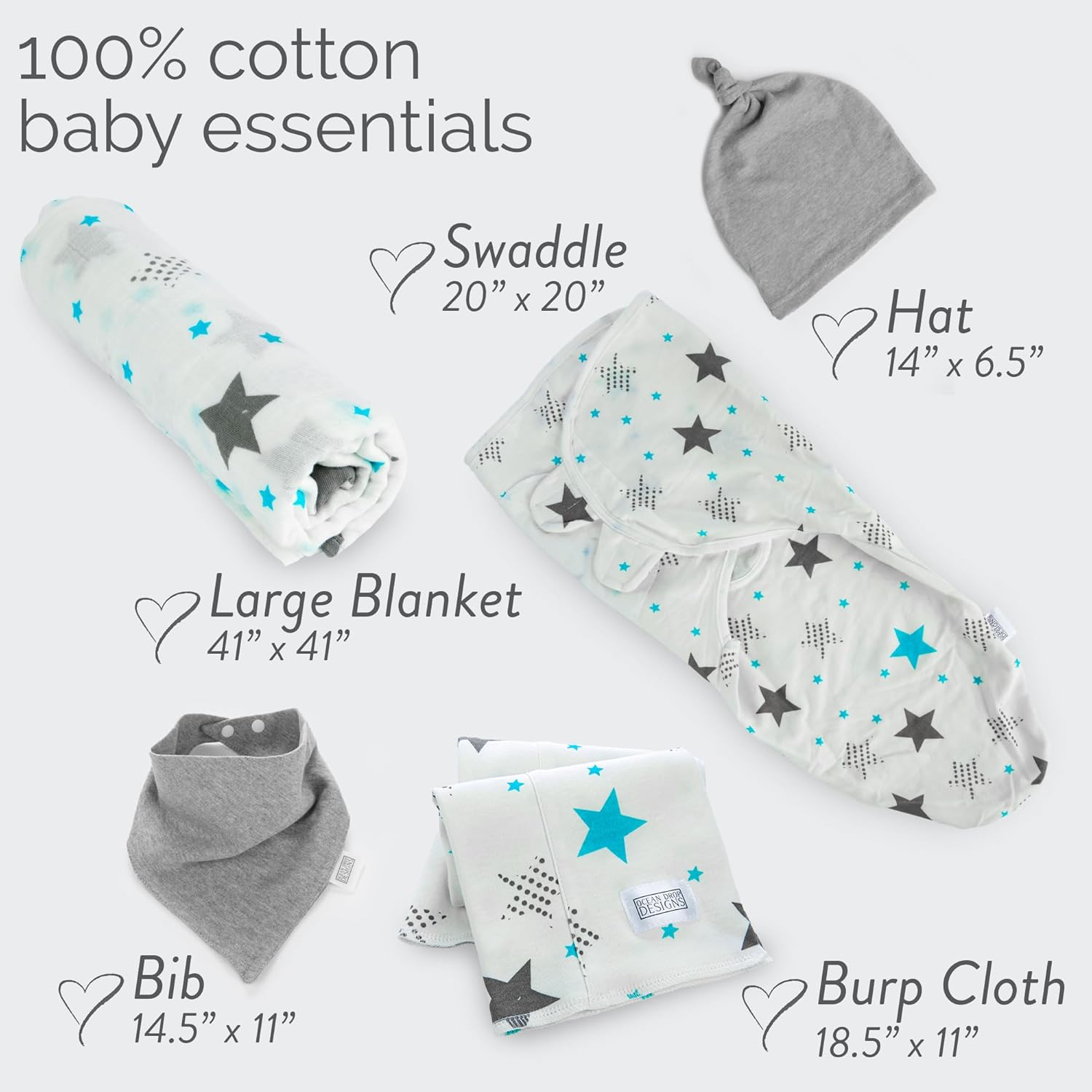 NEWBORN ESSENTIAL MUST HAVES: 100% Cotton machine washable newborn gift set comes in either blue, pink, or grey. Perfect fit for newborns (0-3 MONTHS). The Ocean Drop 5pc set has a 100% cotton swaddle, hat, bib, burp cloth, and muslin blanket in a gift box. Perfect for baby showers or new parents.