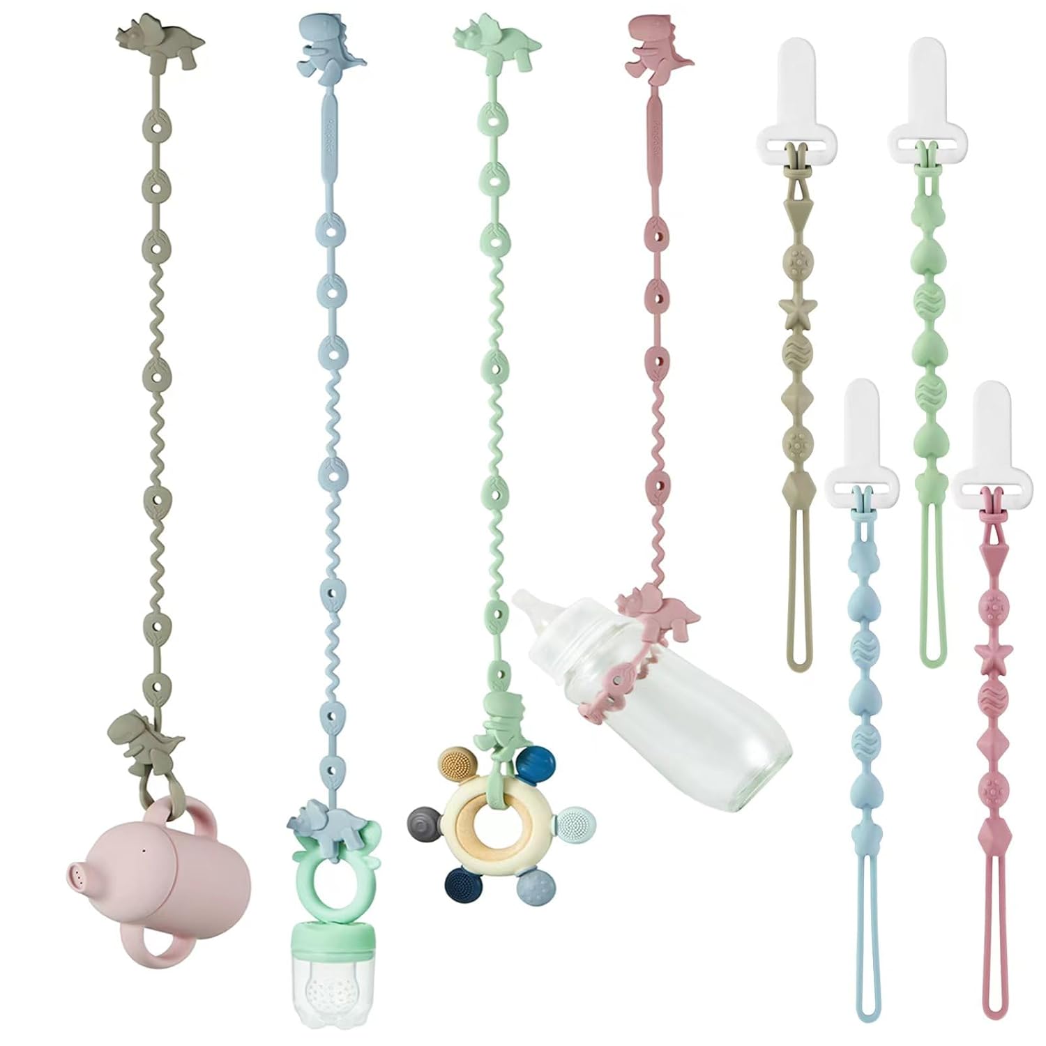 Prevent Loss: Keep pacifiers, teether toys, bottles, and accessories secure. No more worrying about dropped items on the ground during walks, meals, or travels.