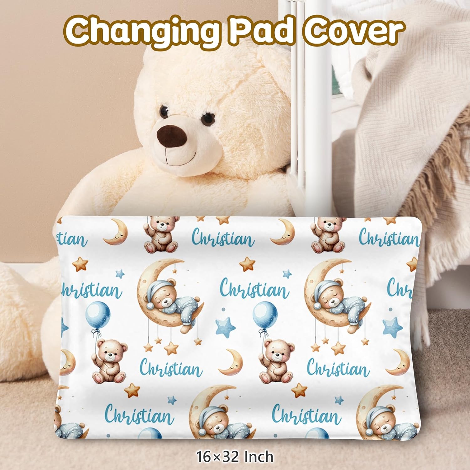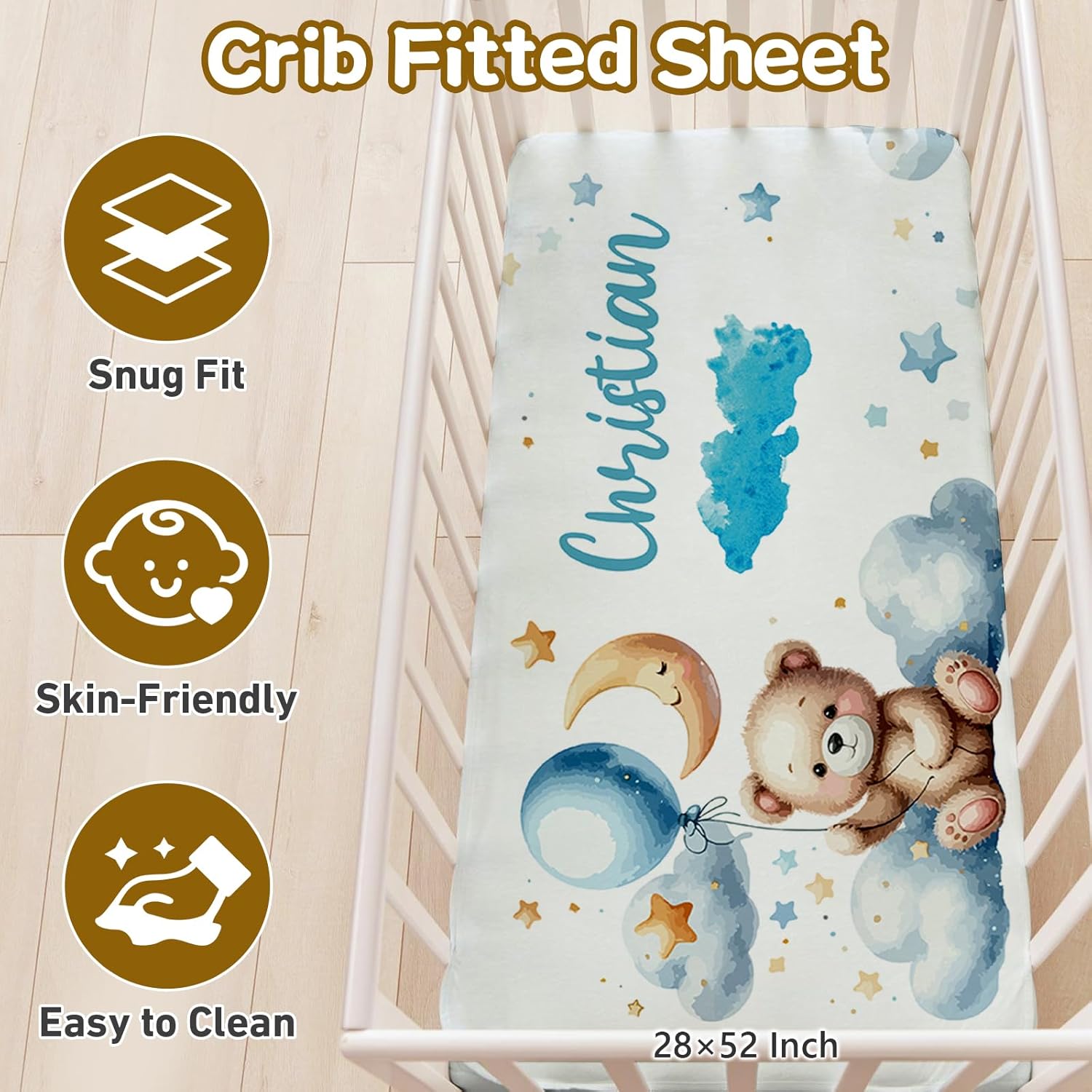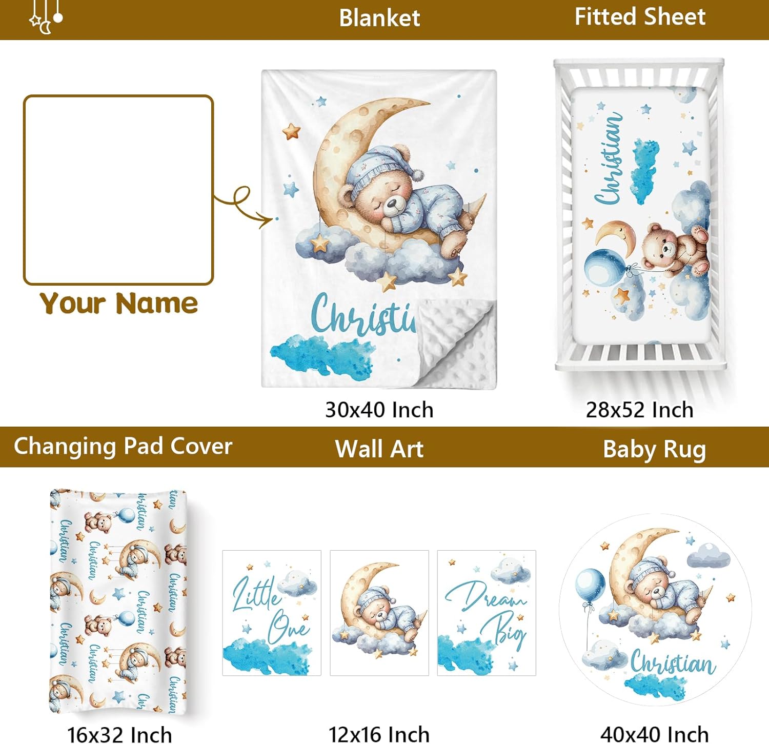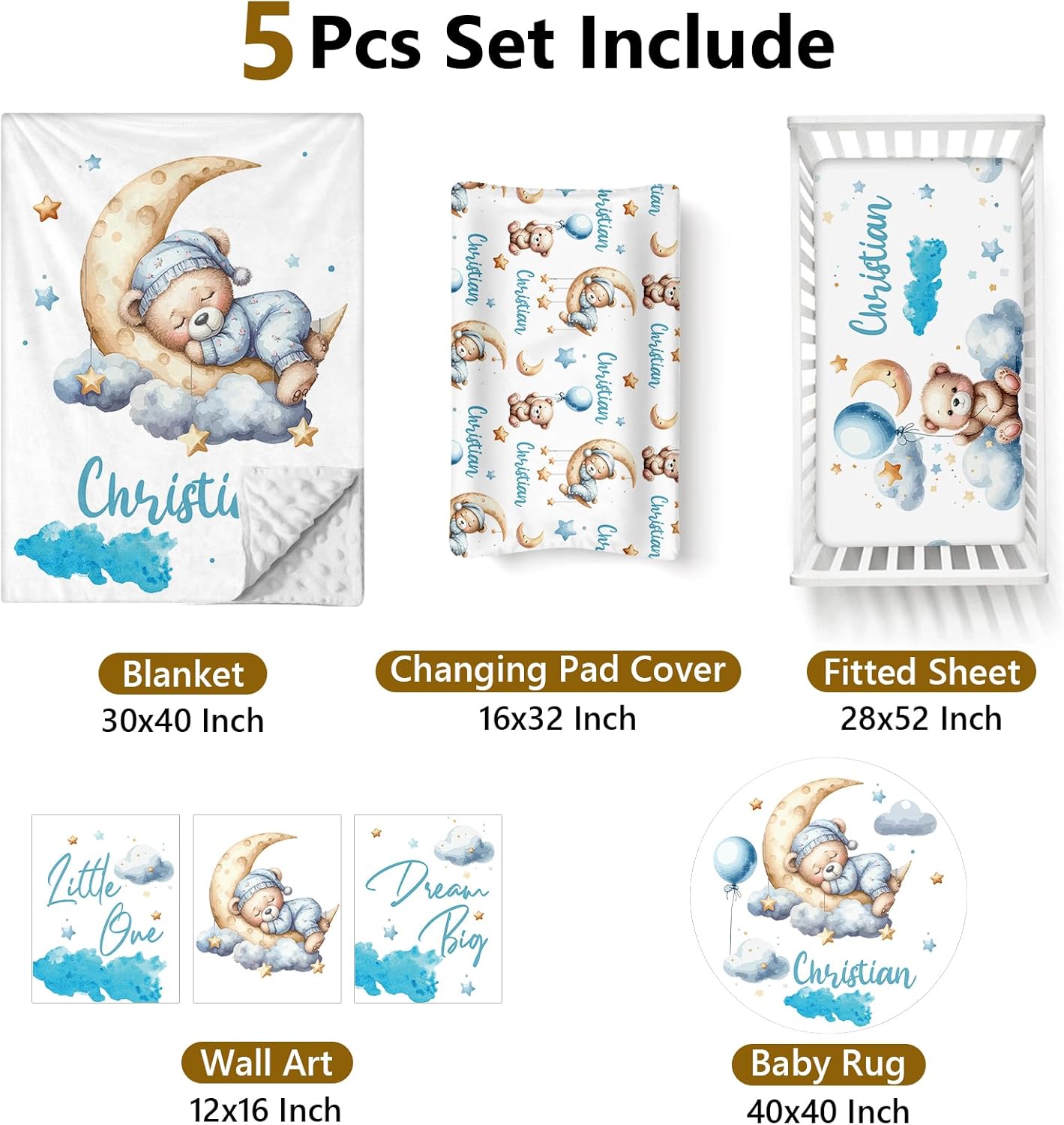 Ideal Bedding Set: Our personalized crib bedding set for boys & girls Includes everything you need: a soft Flannel with Double Layer Dotted Backing blanket, a changing pad cover, a rug, fitted crib sheet and a wall art set. This set adding a charming style to the room.