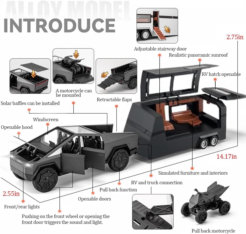 1:32 Scale Exact Replica Model of Pickup Truck Trailer RV, Die-Casting Vehicle Pull Back Toy with Sound and Light