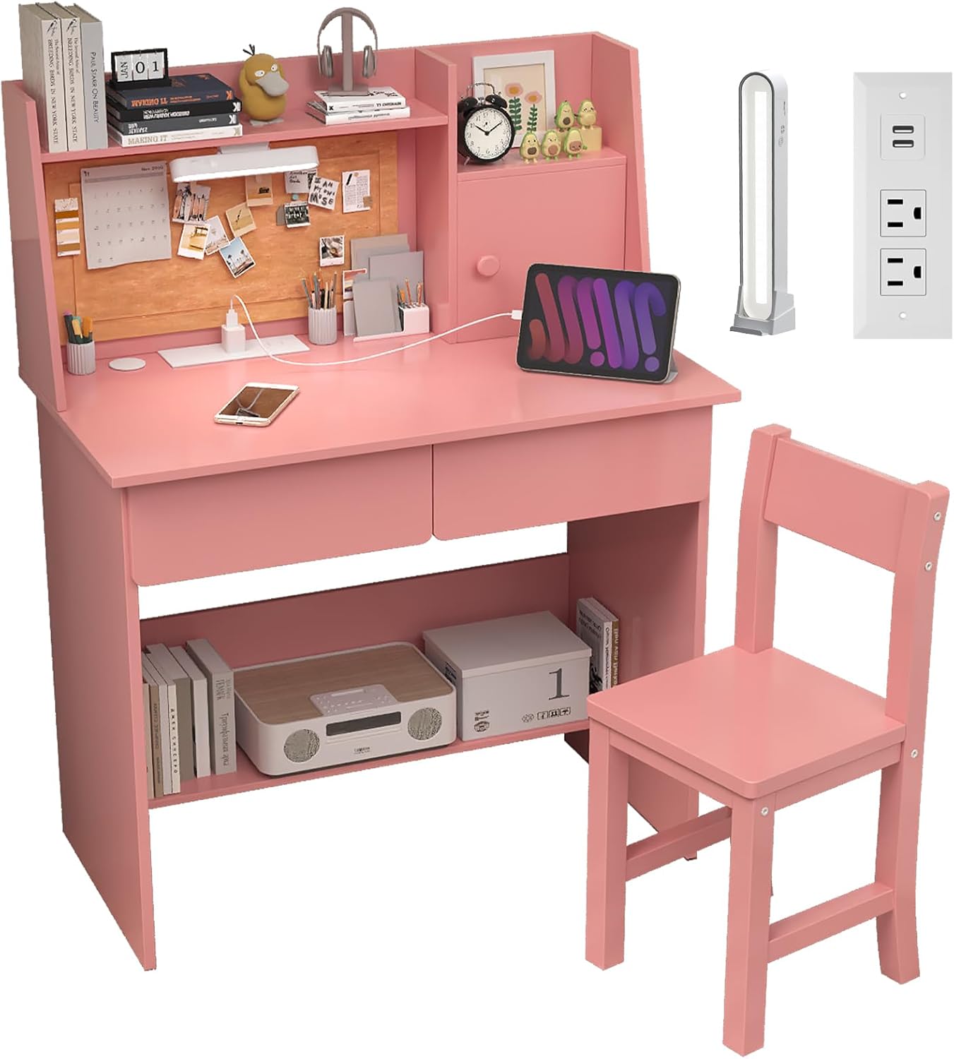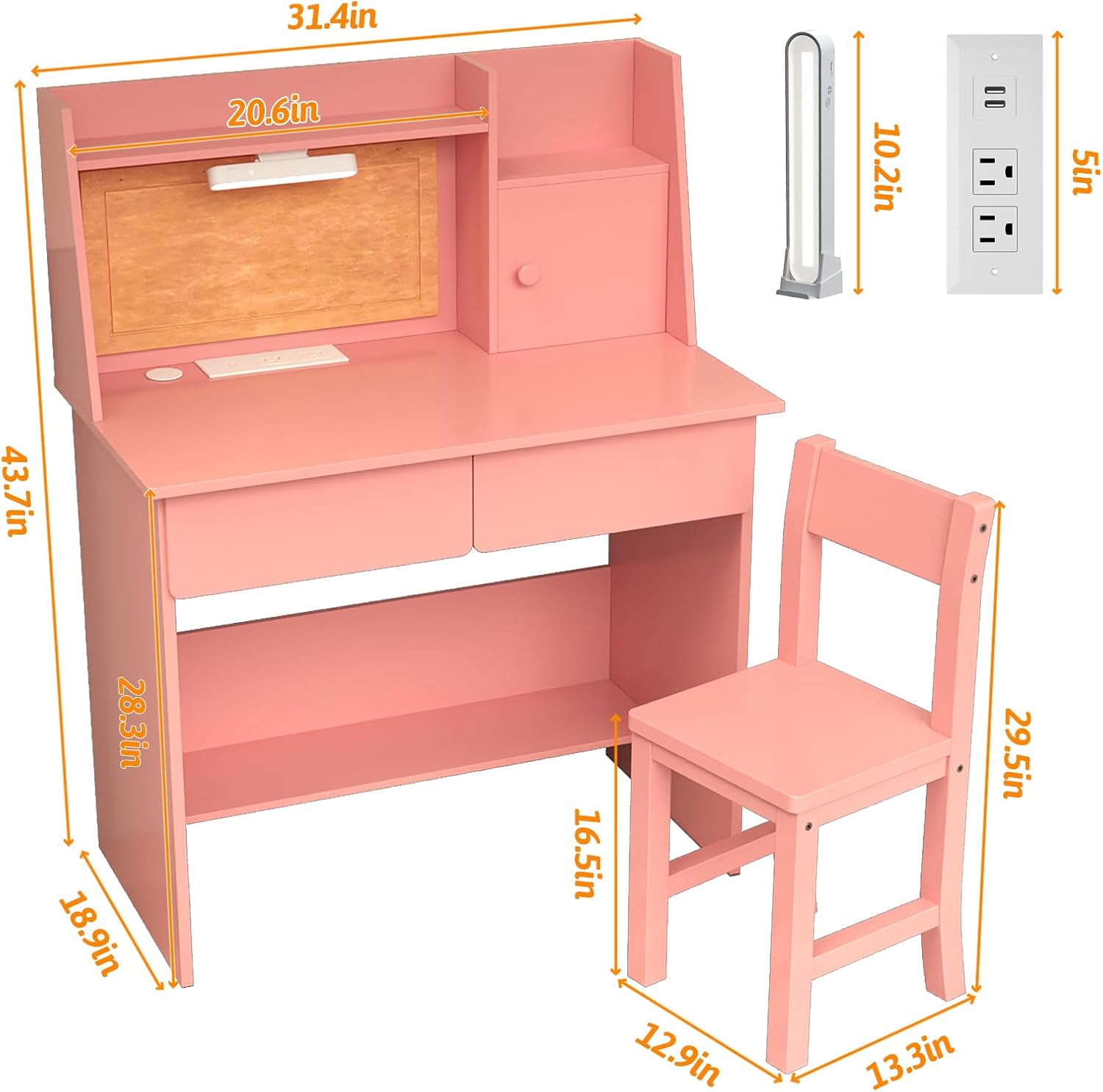 This kid’s desk and chair set comes with a clipboard, a cabinet, and two drawers, The desk offers you ample space to keep books, documents,and other things. Above Desktop with 2USB Ports and 2Outlets Connects to laptops and desk lamps, with 3-Color Lights,suitable for adults and children.
