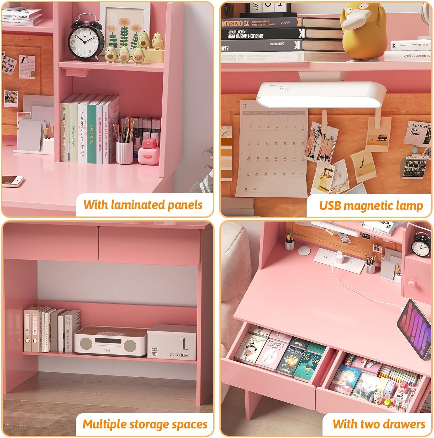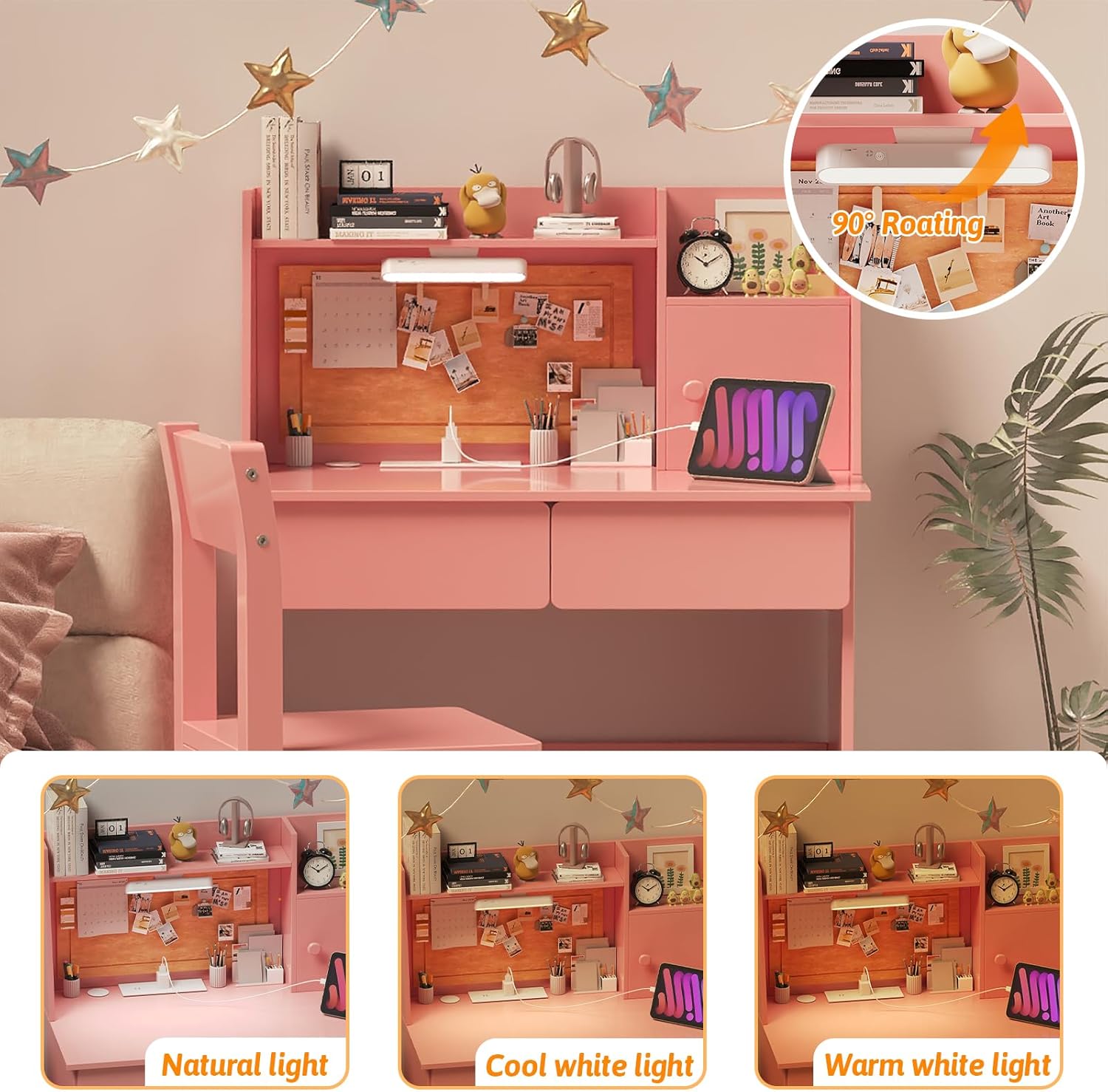 【Kids Study Table with 3-Color Lights】- kid desk equipped with detachable LED lamp,Easily paste the base of the lamp onto the computer desk for an immersive ambiance. 80° rotating multifunctional desk lamp with strong magnetic adsorption.Short press the switch to switch the light color: warm yellow, warm white, and cool white. adjust the brightness according to different scenes and needs by long pressing the switch. add a sense of glamor and style.This children’s study desk is perfect for writing, drawing, reading, and more. By adjusting the brightness, children can be more focused on learning.-WtN1mt