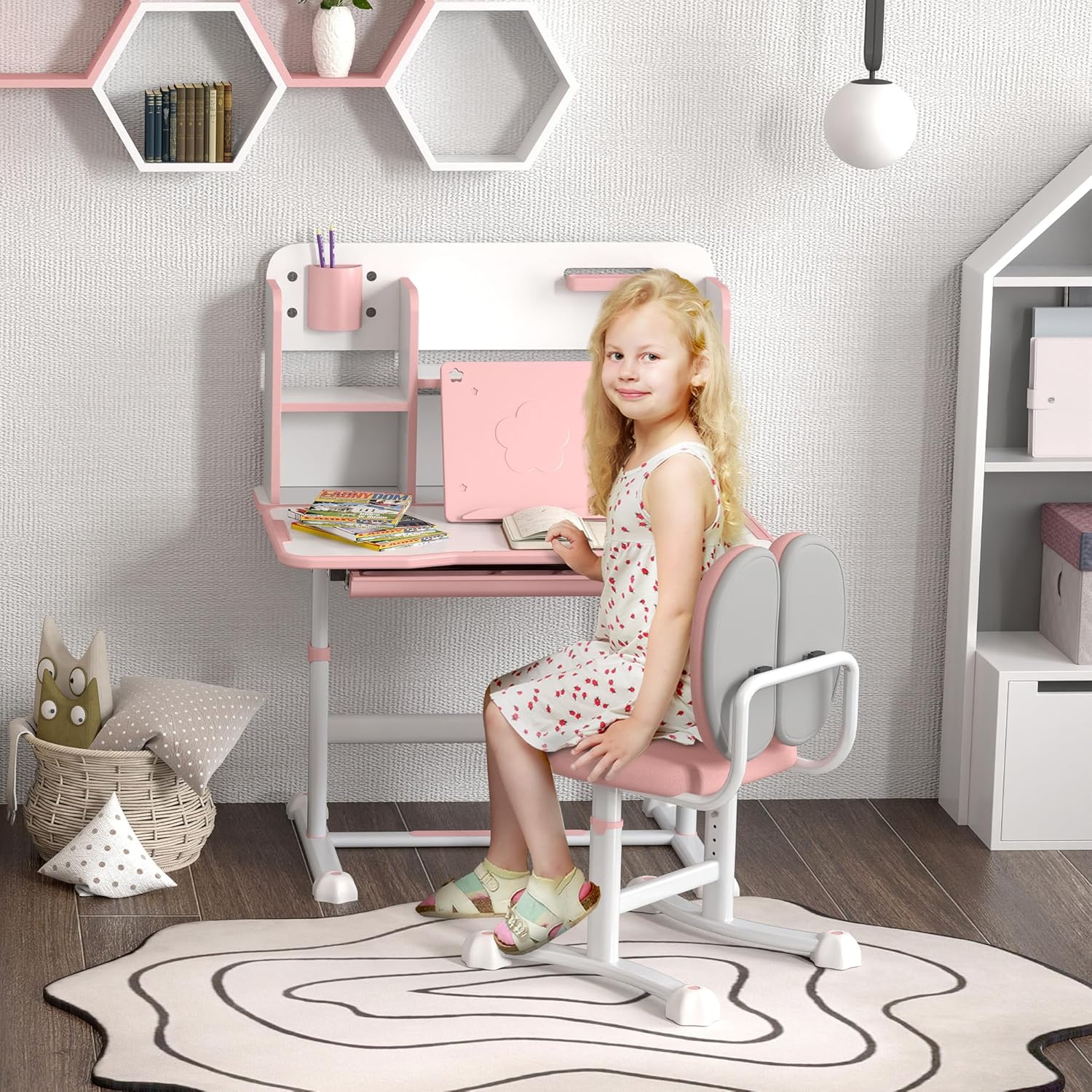 Discover the Qaba kids desk and chair set, crafted with an MDF tabletop and strong steel legs. The spacious surface tilts from 0-45° for optimal posture, while adjustable anti-slip foot pads ensure stability. Great for everything from art projects to homework, this student desk and chair set is a must-have for any young student’s study space.
