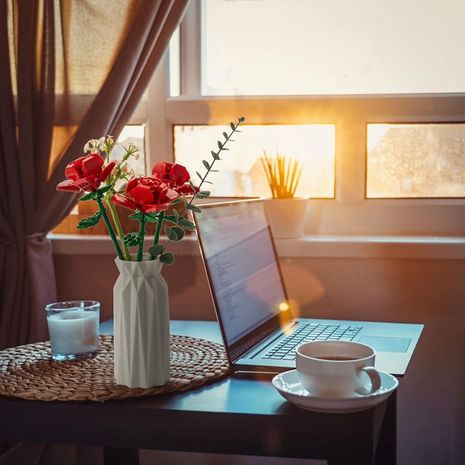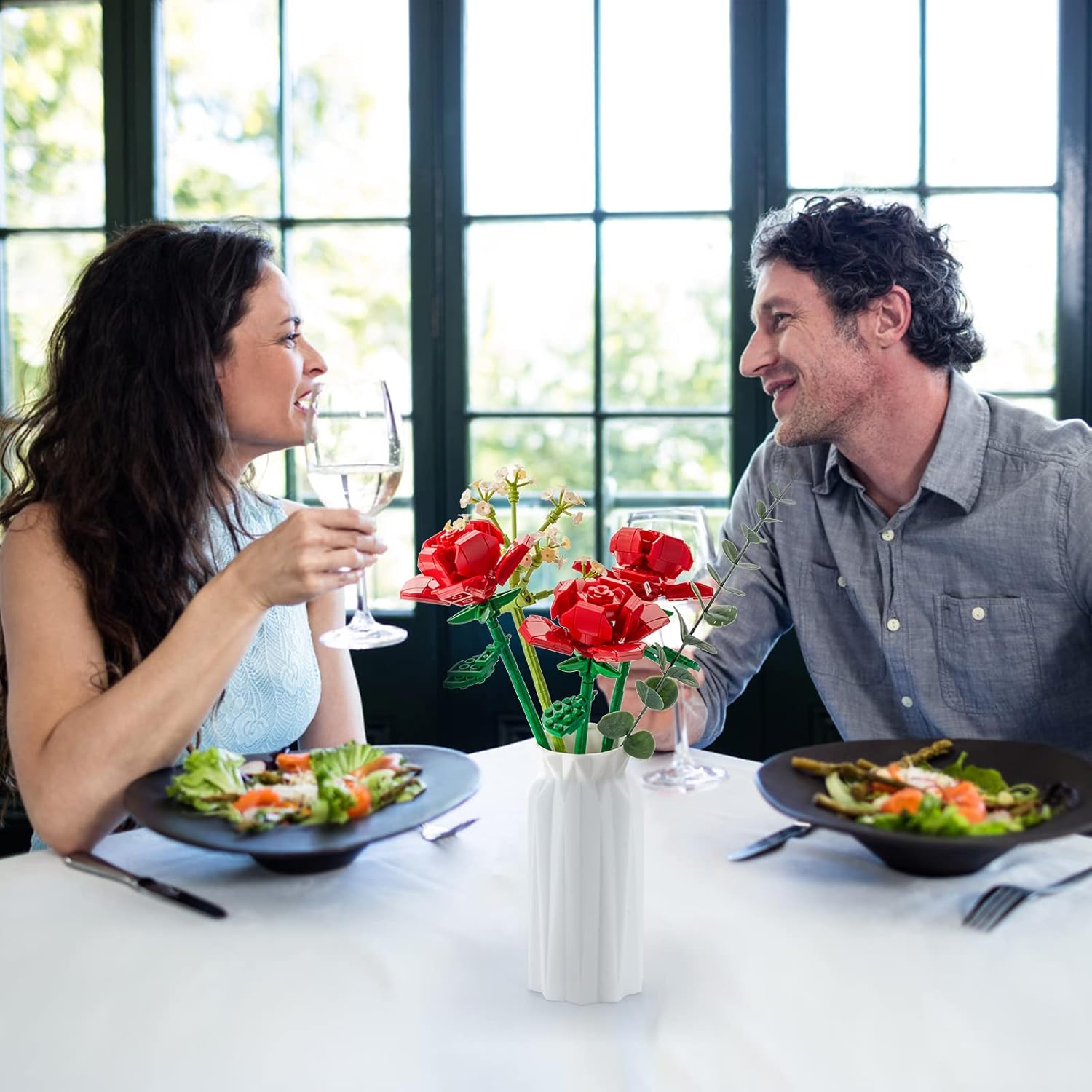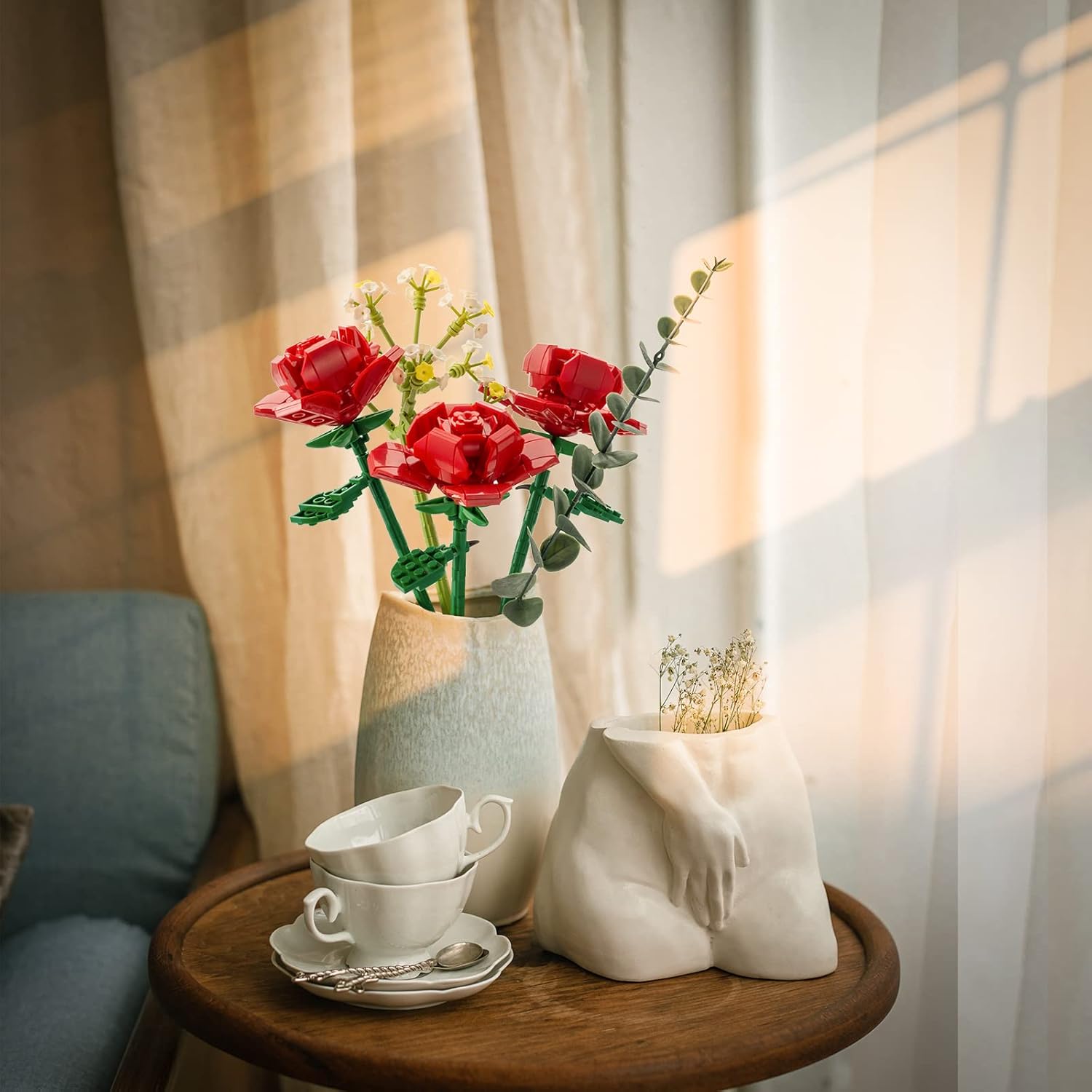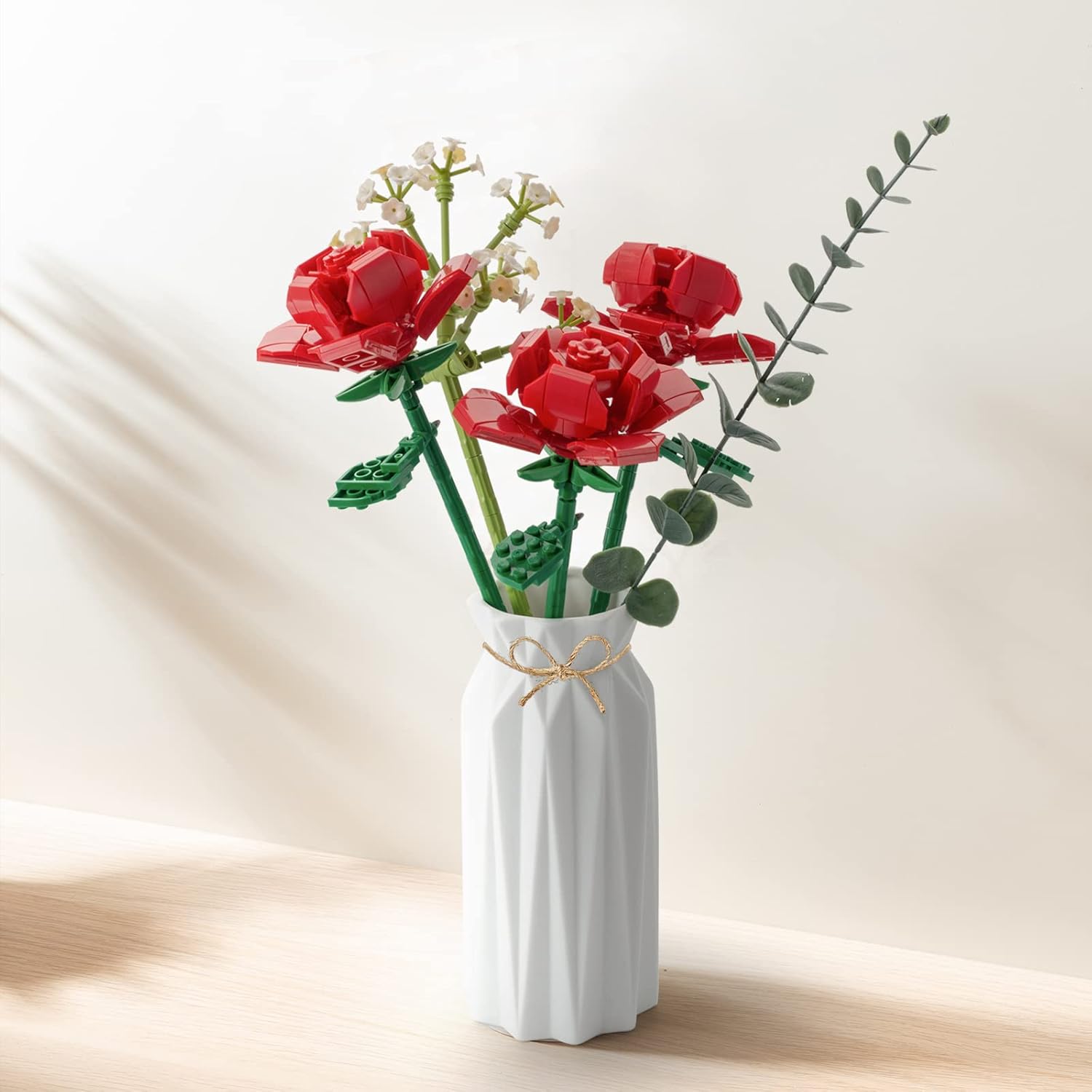 Rose Flowers Bouquet Building Set:It consists of three red rose blocks, one Baby’s breath flower blocks and one artificial eugalier leaf,the motto is: Eternal love.(NOT including Vases)