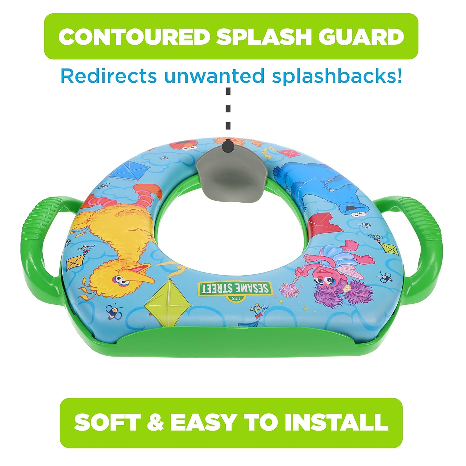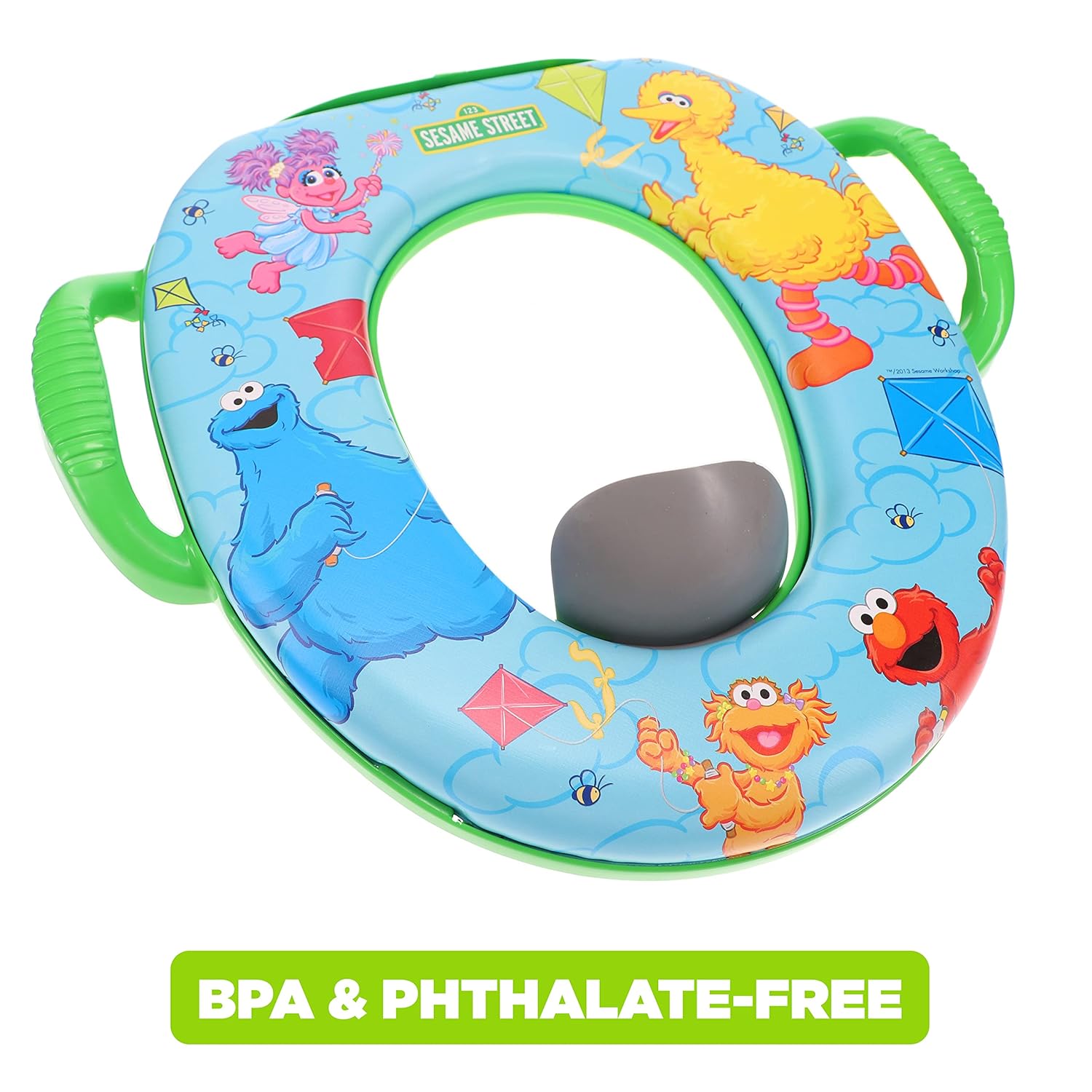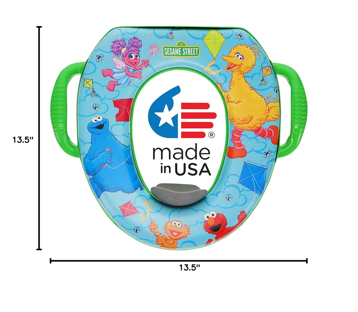 Sesame Street is a special place for little ones to learn, so the residents of Sesame Street are the perfect friends to teach your child how to use the potty with this Sesame Street “Let’s Fly a Kite” Soft Potty Seat! There’s no better way to encourage your child to start using the adult toilet than by bringing in their favorite characters from Sesame Street! This cute and colorful potty seat is constructed with durable plastic and built to last. The Patented, Easy Grip Handle design helps your little one feel safe & secure on the toilet and aids in building independence throughout the potty training process. This soft, cushioned seat is a welcome alternative for children to use versus hard plastic ones. Also included is an easy to install, soft, contoured splash guard that redirects unwanted splashbacks that may occur during potty training. All components come apart for an easy clean that gets every inch. These seats are a safe option all around as they are both BPA & Phthalate-Free! This potty seat fits on most regular & elongated toilet seats so it is ready to use anywhere in the house.