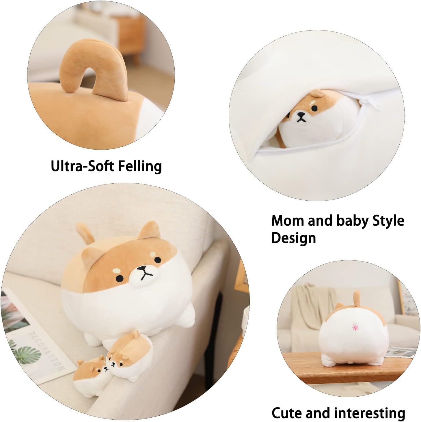 Five Toys in One: The shiba inu stuffed animal toys comes with a surprise in her belly, 4 baby cute shiba inu that can be removed through the zipper opening on mommy’s tummy.