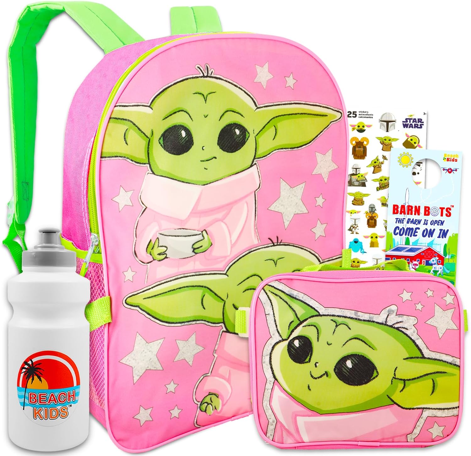 Baby Yoda Backpack with Lunch Box for Girls – Bundle with Baby Yoda Backpack, Lunch Box, Water Bottle, Stickers, More | Mandalorian Backpack with Lunch Box Set. This Star Wars backpack and lunch box set includes one 15 inch backpack with adjustable shoulder straps and one insulated lunch box, each depicting colorful images of Baby Yoda. Show off your love of Baby Yoda in style! This Mandalorian backpack has plenty of room to carry everything you need to school and your insulated Star Wars lunch bag will keep your food at the perfect temperature for hours. Sure to be a hit with Mandalorian fans of all ages, this Baby Yoda backpack and lunch bag set makes a great gift for anybody who loves Baby Yoda and pairs perfectly with all other Star Wars merchandise. Officially licensed Baby Yoda backpack and lunch box set for kids of all ages, boys and girls alike, also comes with a Beach Kids water bottle, Baby Yoda stickers and a Barn Bots door hanger.
