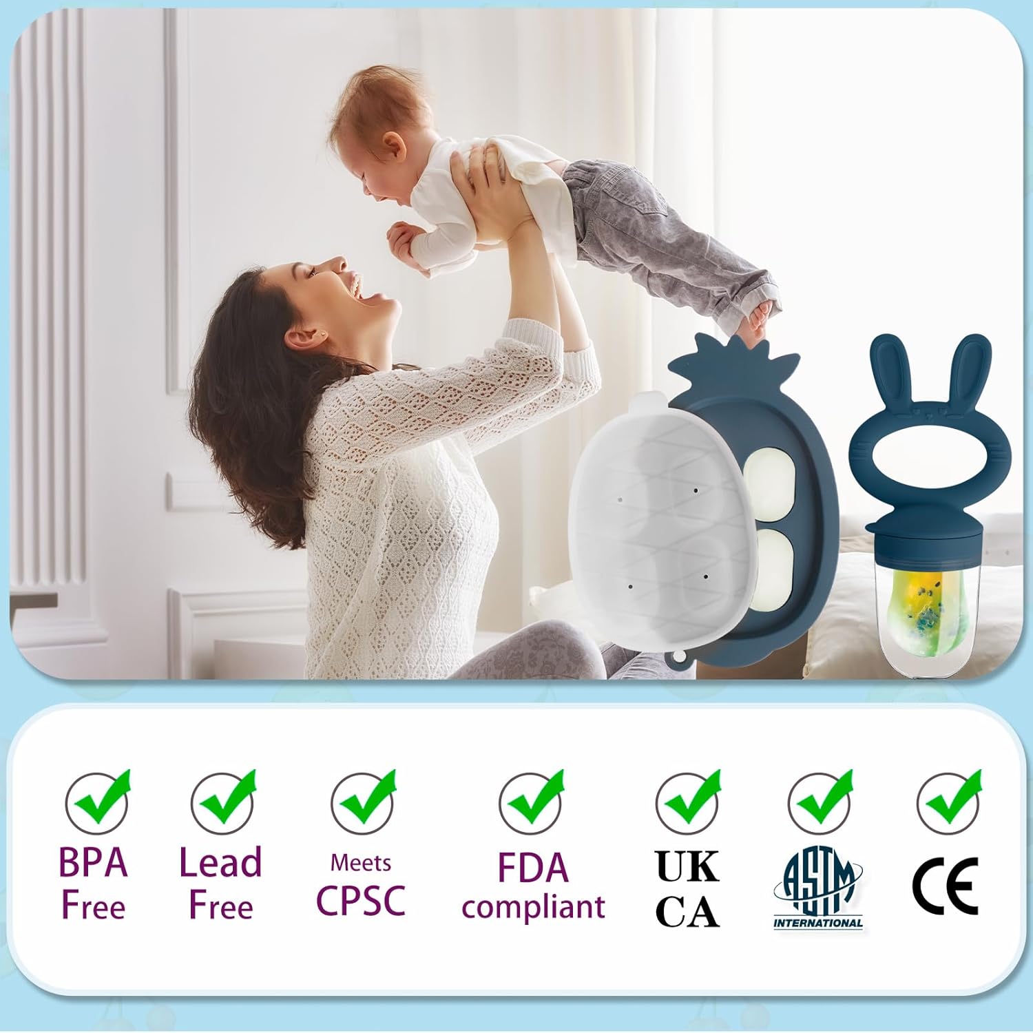 Premium Silicone Construction: Our feeder boasts a seamless silicone design, ensuring safety during every chew and suck. BPA, latex, lead, and phthalate-free, it’s a worry-free choice for your baby’s health.