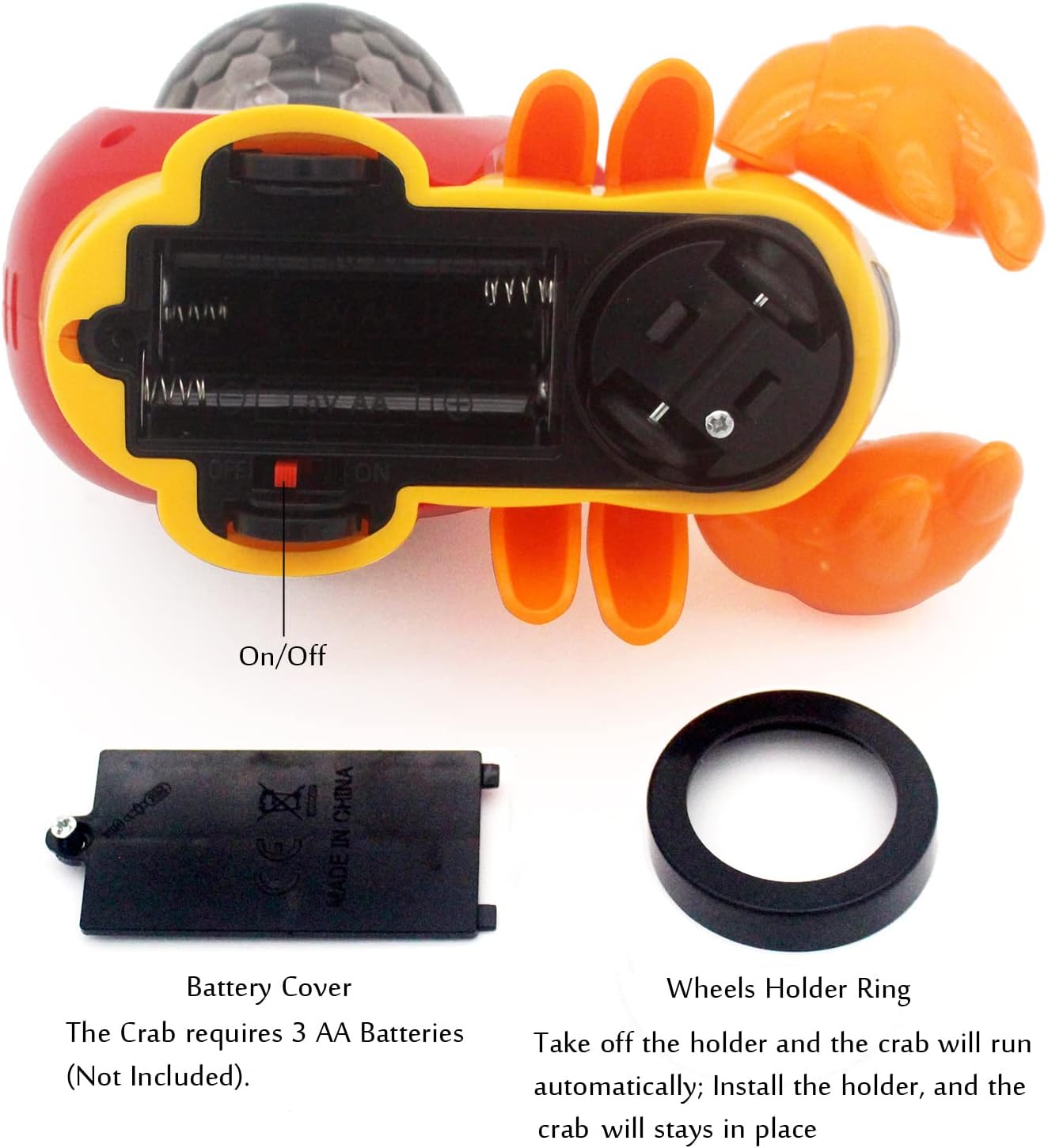 【Crab Battery】The crab is powered by 3 AA Batteries (Not Included). You can buy the batteries in a local store.
