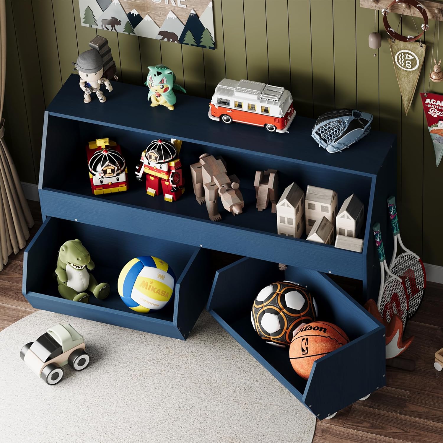 👶Maximum space efficiency: The Zopend Toy storage chest features an extra wide opening to maximize the storage space, which is easy for children to reach and help them find their favorite toys. The toy storage shelf also provides two toy bins with wheels, so kids can move more toys and help parents to tidy up the toys.
