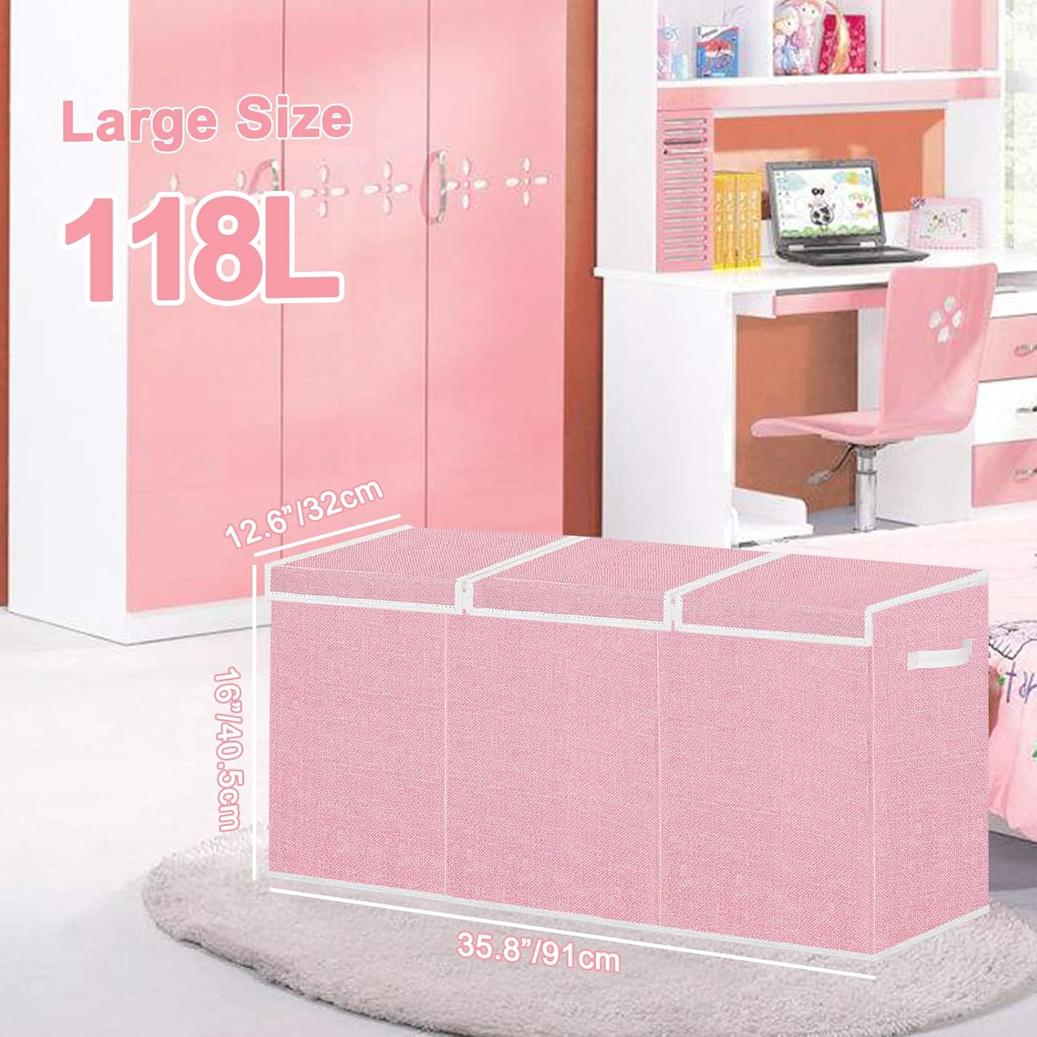 This kids toy box measures 35.8″x12.6″x16″(91x32x40.5 cm),Can hold more than 118 liters.which is large enough to hold kinds of toys and dolls.