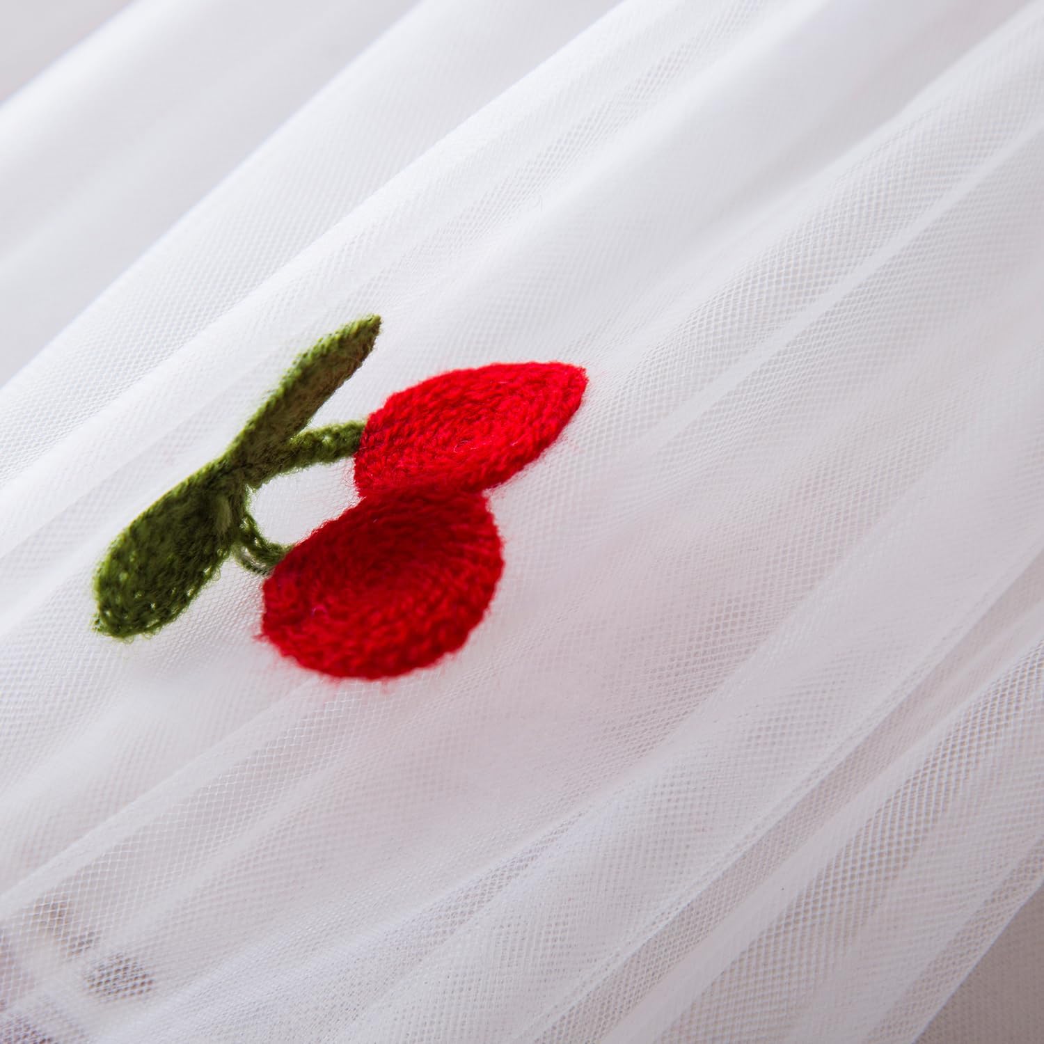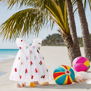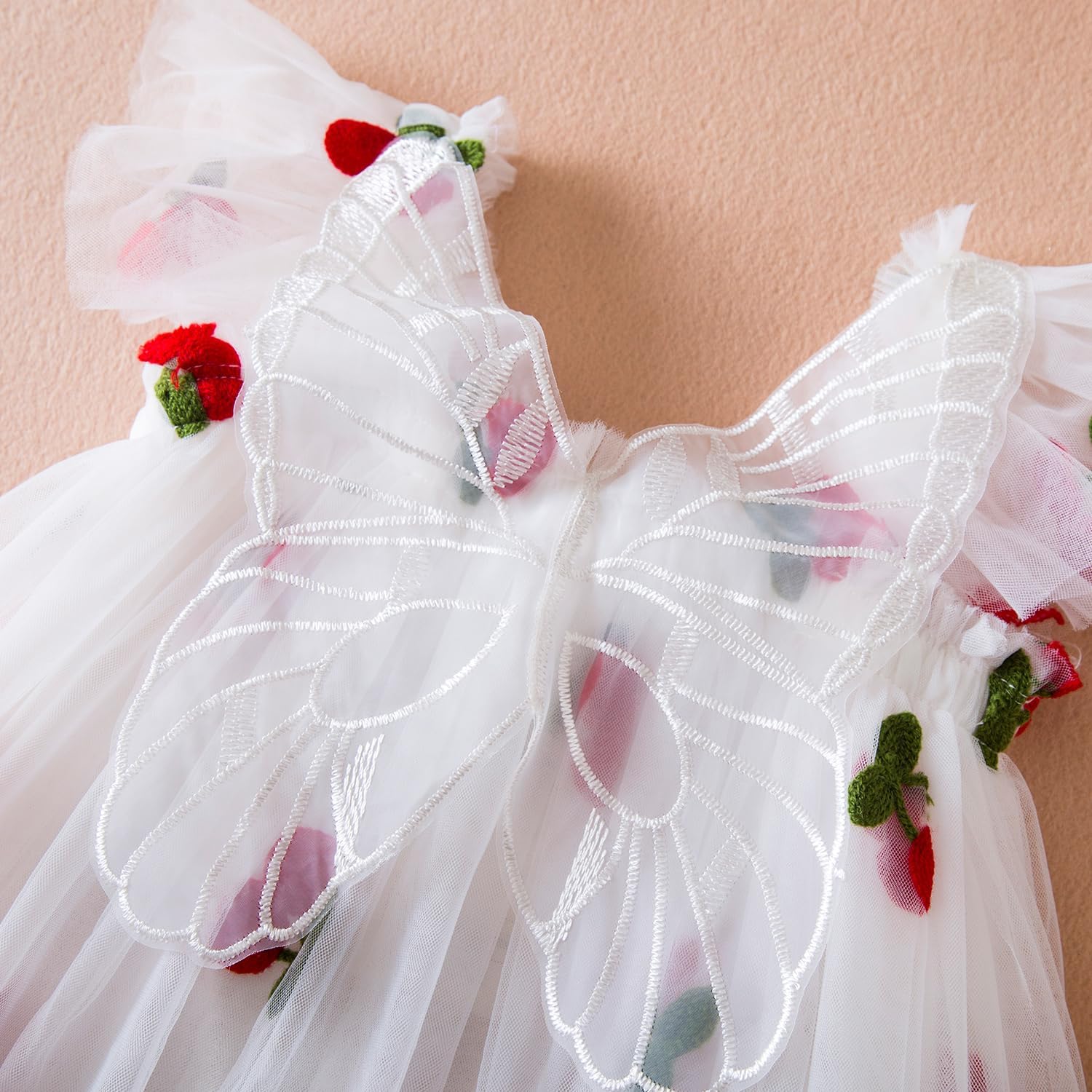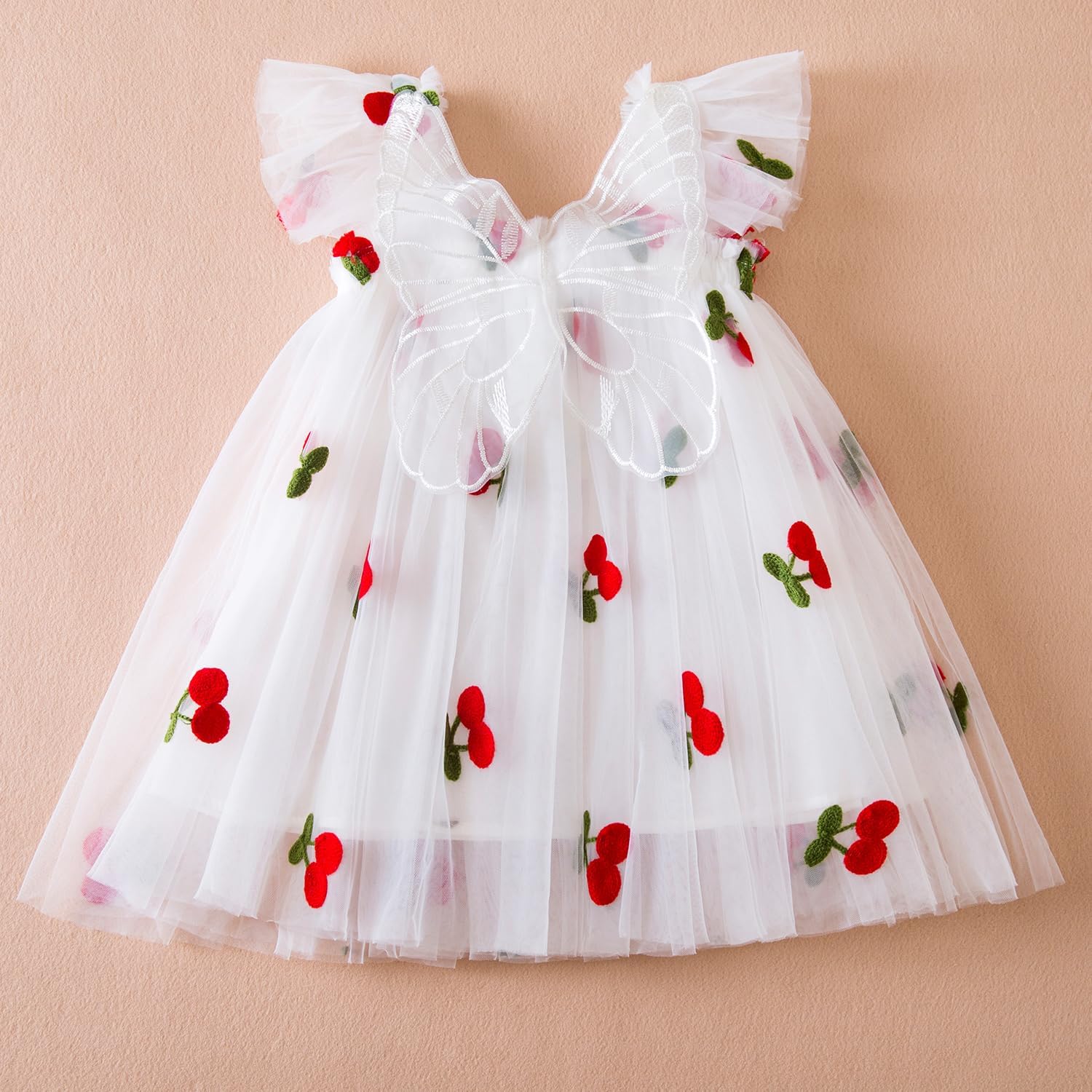 Charming Cherry Embroidery: The dress features adorable red cherry and green leaf embroidery scattered across the soft tulle, adding a playful and sweet touch to the design.Butterfly Wing Design: A standout feature is the delicate, transparent butterfly wings attached to the back, creating a magical, fairy-like look — perfect for little girls who love a bit of fantasy.Ruffle Sleeves & A-line Silhouette: The ruffled sleeves and classic A-line shape enhance the dress’s elegance, ensuring a flattering and comfortable fit for toddlers and young girls.Breathable & Lightweight Fabric: Crafted from high-quality, breathable mesh and soft lining, this dress keeps kids cool and comfortable during summer events.Versatile for All Occasions: Ideal for birthdays, family gatherings, summer vacations, beach outings, photo shoots, and holiday parties — a dress suited for both casual and special moments.