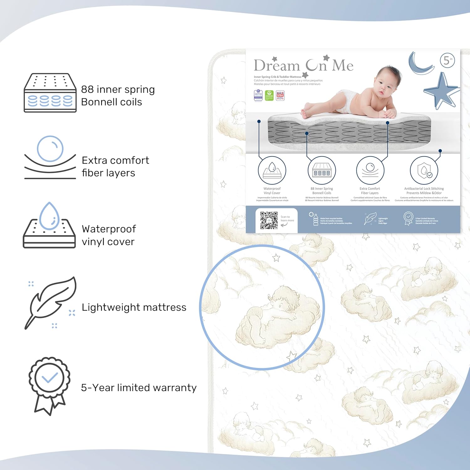 Your baby will curl-up in comfort on the Twilight Spring Coil Mattress by Dream On Me. Constructed with quality materials and workmanship this mattress is manufactured with pride in the USA. This mattress offers 80 durable, interwoven, heat tempered, steel coils providing supreme comfort to support his or her growing bones. A protective polyurethane foam wrap on each side delivers a plush sleeping surface. Features include a foam Insulating layer and lock-stitched waterproof binding for lasting durability and a layer of Fire blocker. The Dream on Me mattress meets the 16 CFR 1632 /1633 Federal Flammability tests. The triple laminated waterproof cover is stain-resistant to help protect against liquids leaking inside. Safety is our priority, Dream on Me Twilight Mattress is Greenguard Gold Certified, JPMA Certified and ASTM Certified.
