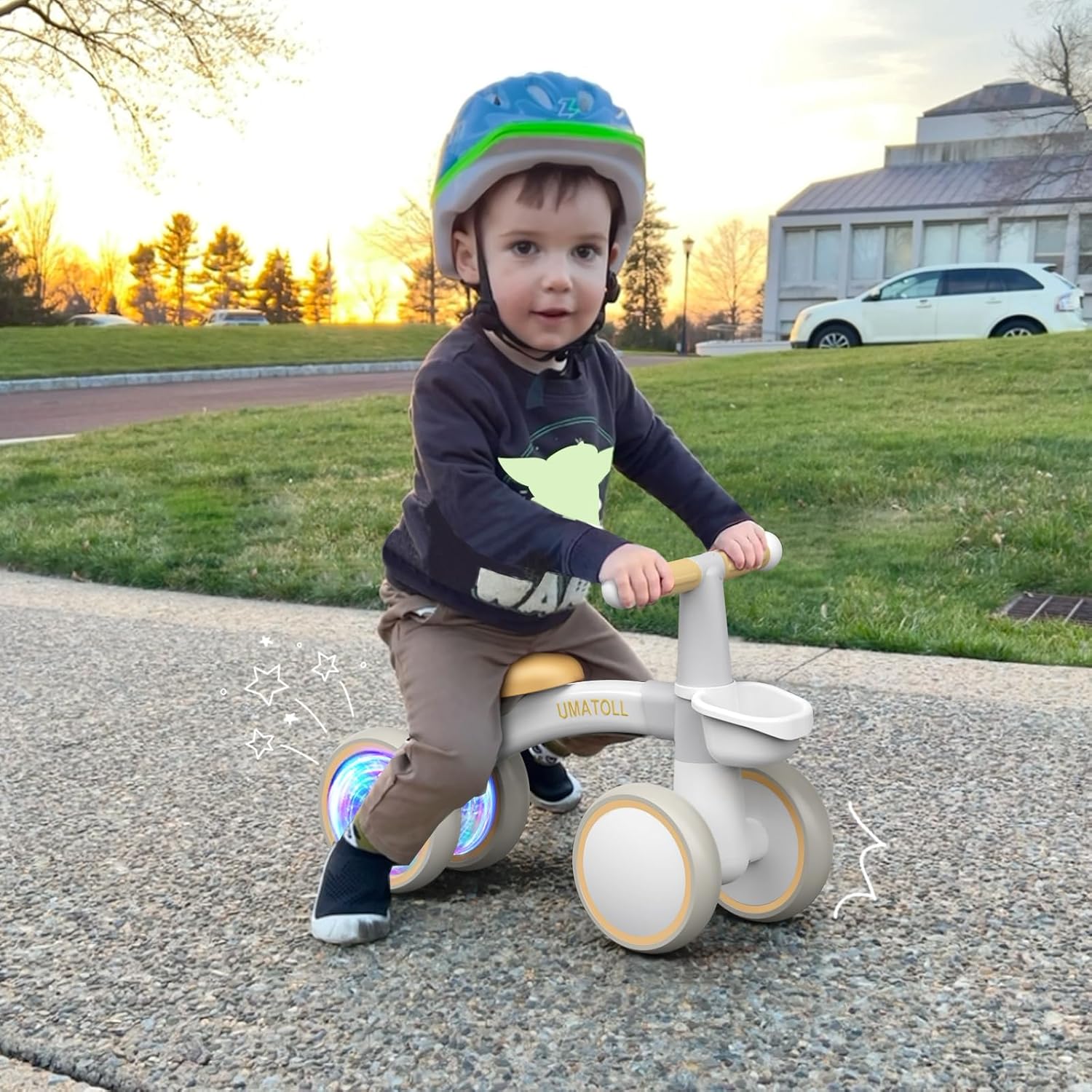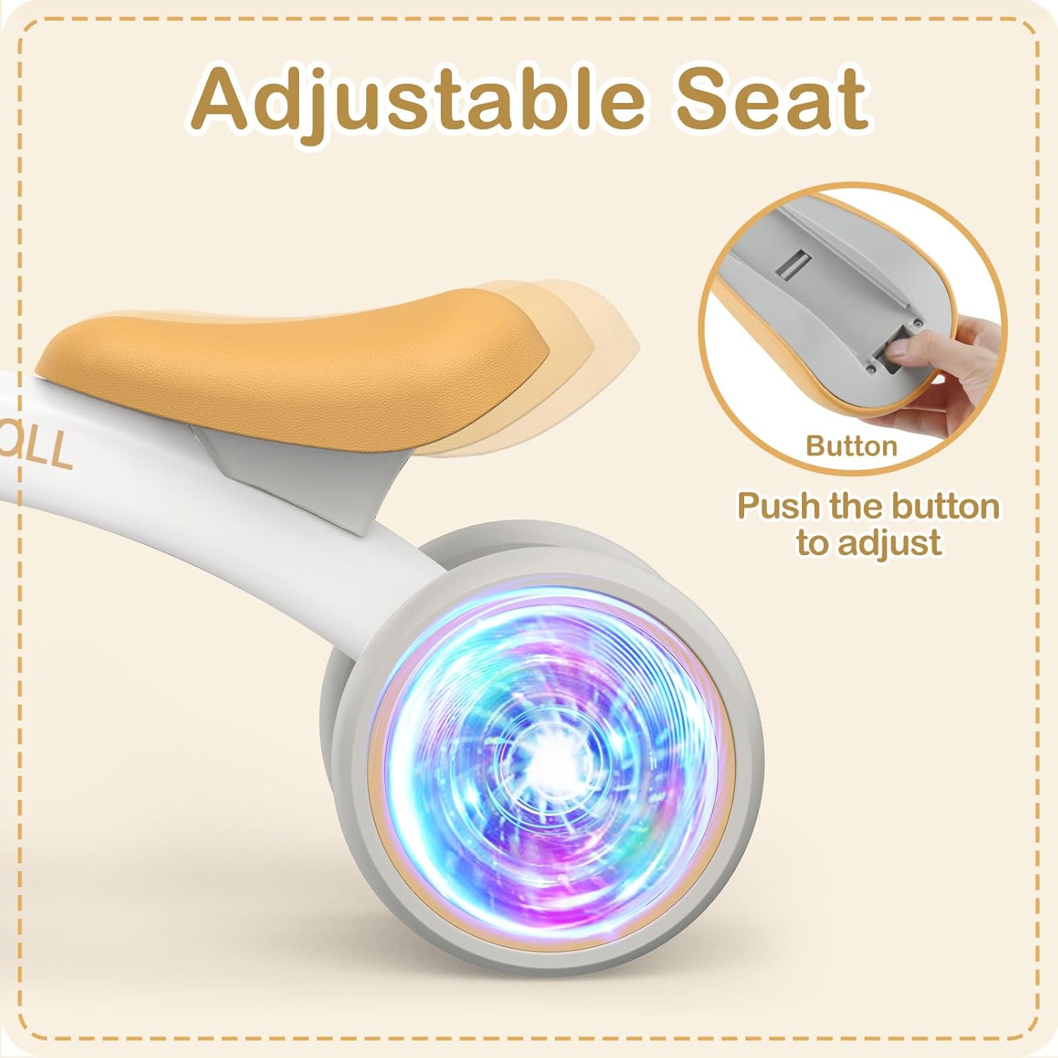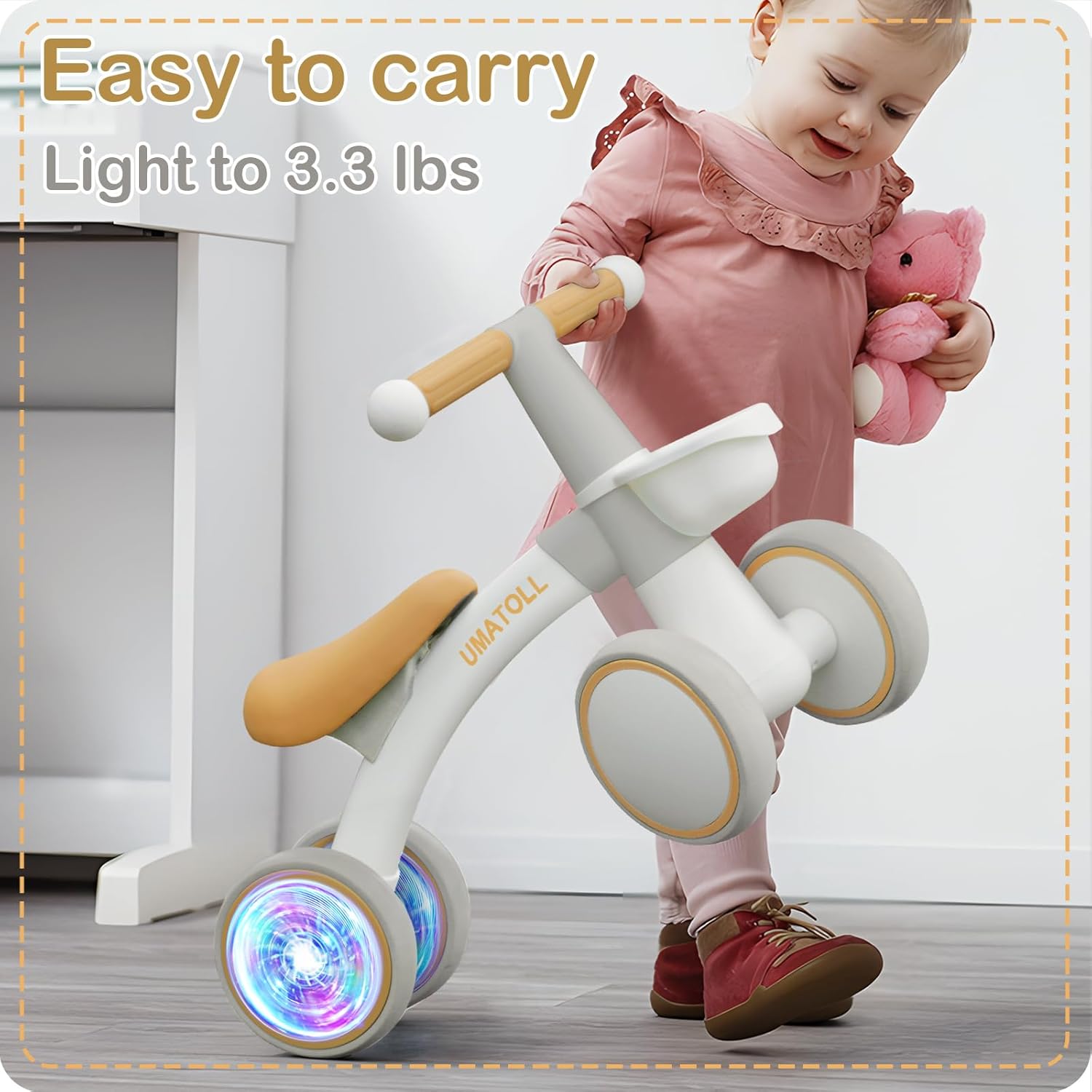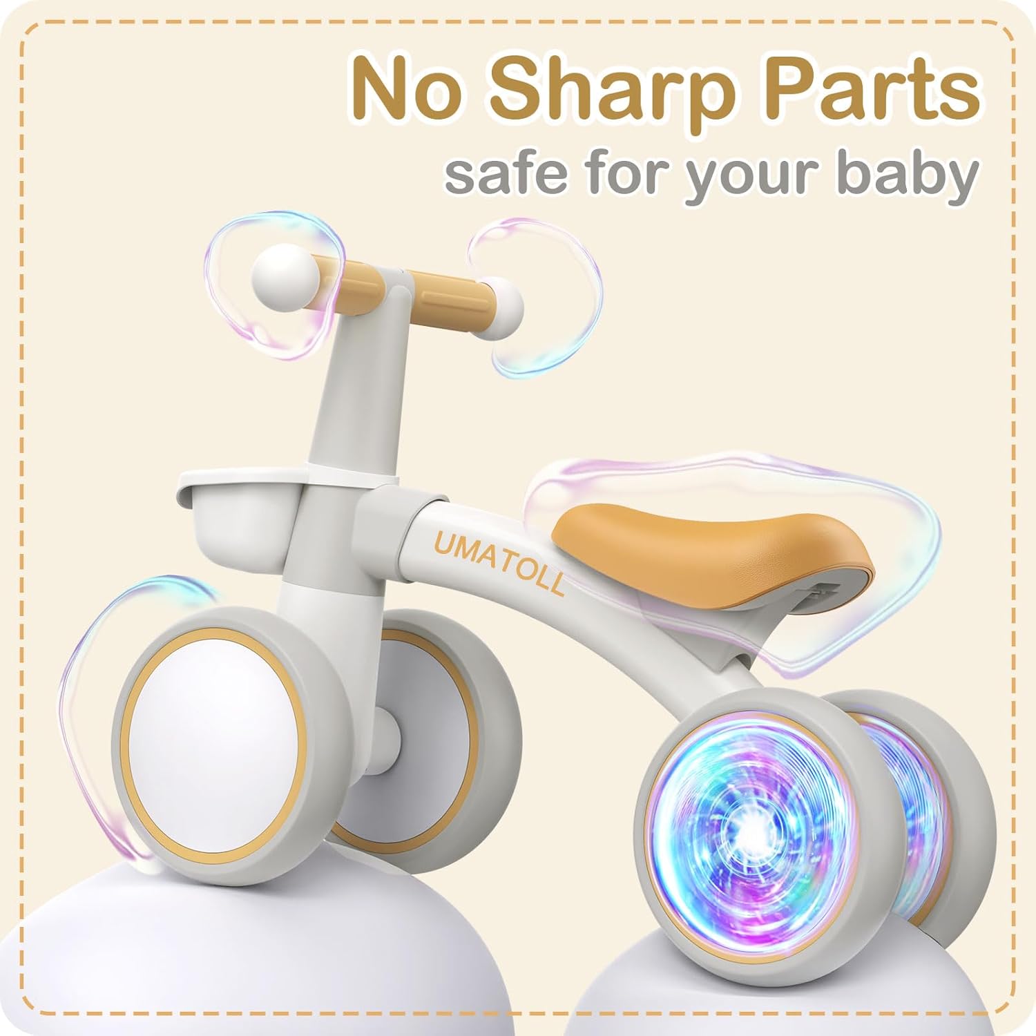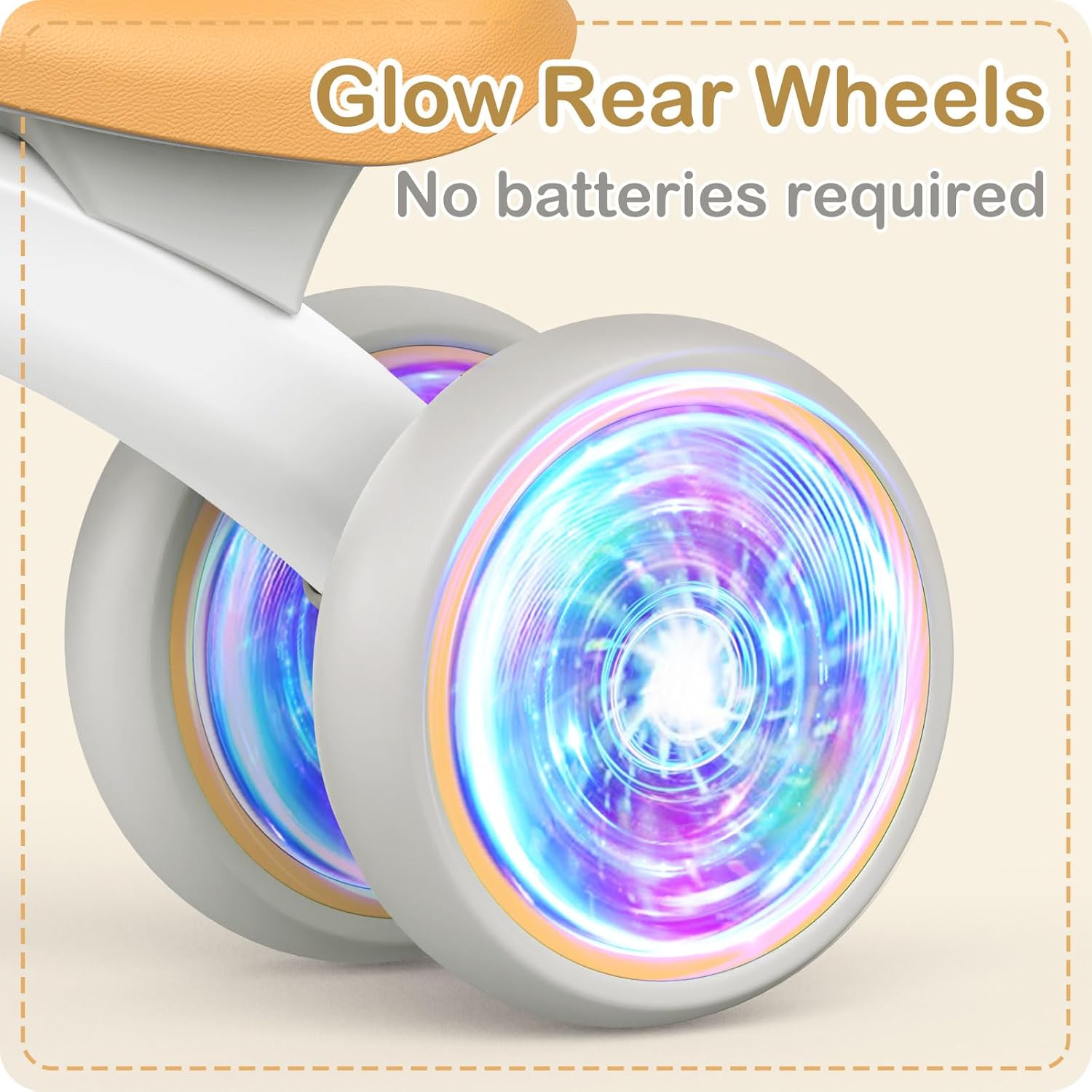 GLOW REAR WHEEL: Colorful lighted rear wheels are more eye-catching to make babies more interested, inspires their curiosity. Bring more fun to your baby. No batteries required, just spin the wheels to glow.