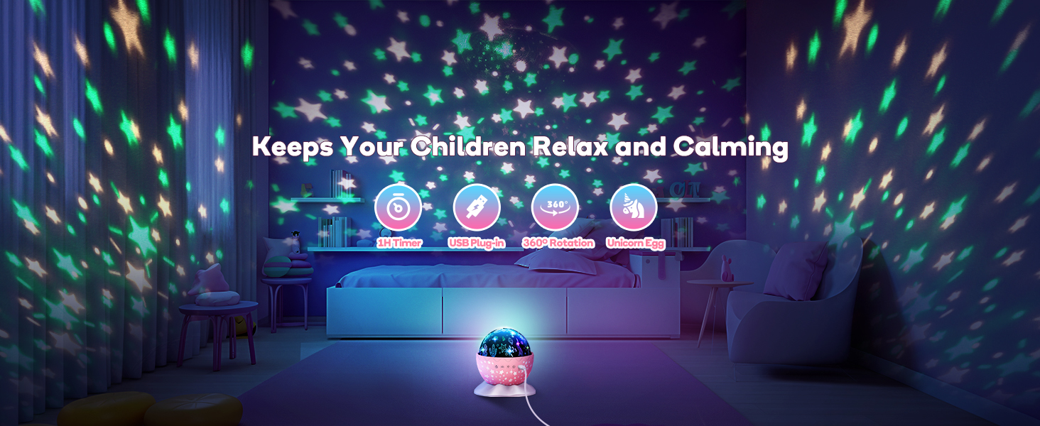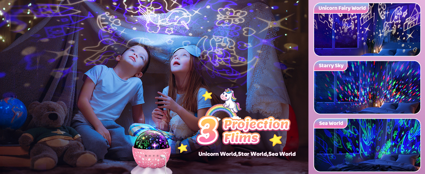 Three Projection Themes: Our bedroom night lights have three projection films to display different patterns. Use one film each time. Unicorn night light theme can turn our girls’ room into a fairy unicorn world. Starlight projector fills the room with scattered stars and moon to keep the romantic vast starry sky indoors. Sea World displays a variety of lovely sea creatures. Multiple patterns can excite interest, inspire girls and develop their understanding of the world
