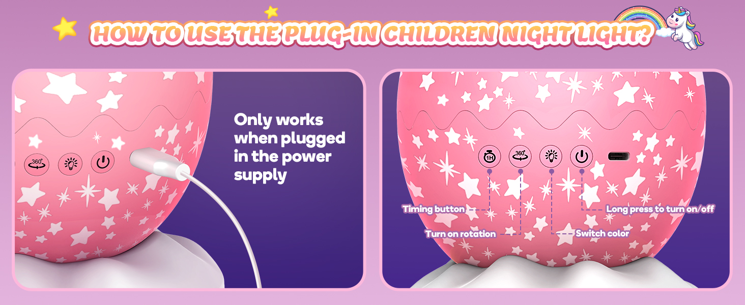 Easy to Use: Our night light is powered by a USB wired(Not rechargeable, no need to buy batteries for baby night light projector! The night lights projector is easy to use with 4 Buttons: From the right first the switch of night light projector, second for color adjustment, third for 360°rotation, fourth for 1h auto-off timer