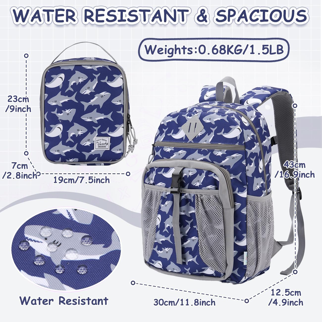 VASCHY Kids Backpack Lunch Bag Set, Boys Large School Bookbag Insulated Lunch Box for Toddlers Preschool,Daycare,Kindergarten,Elementary School Shark