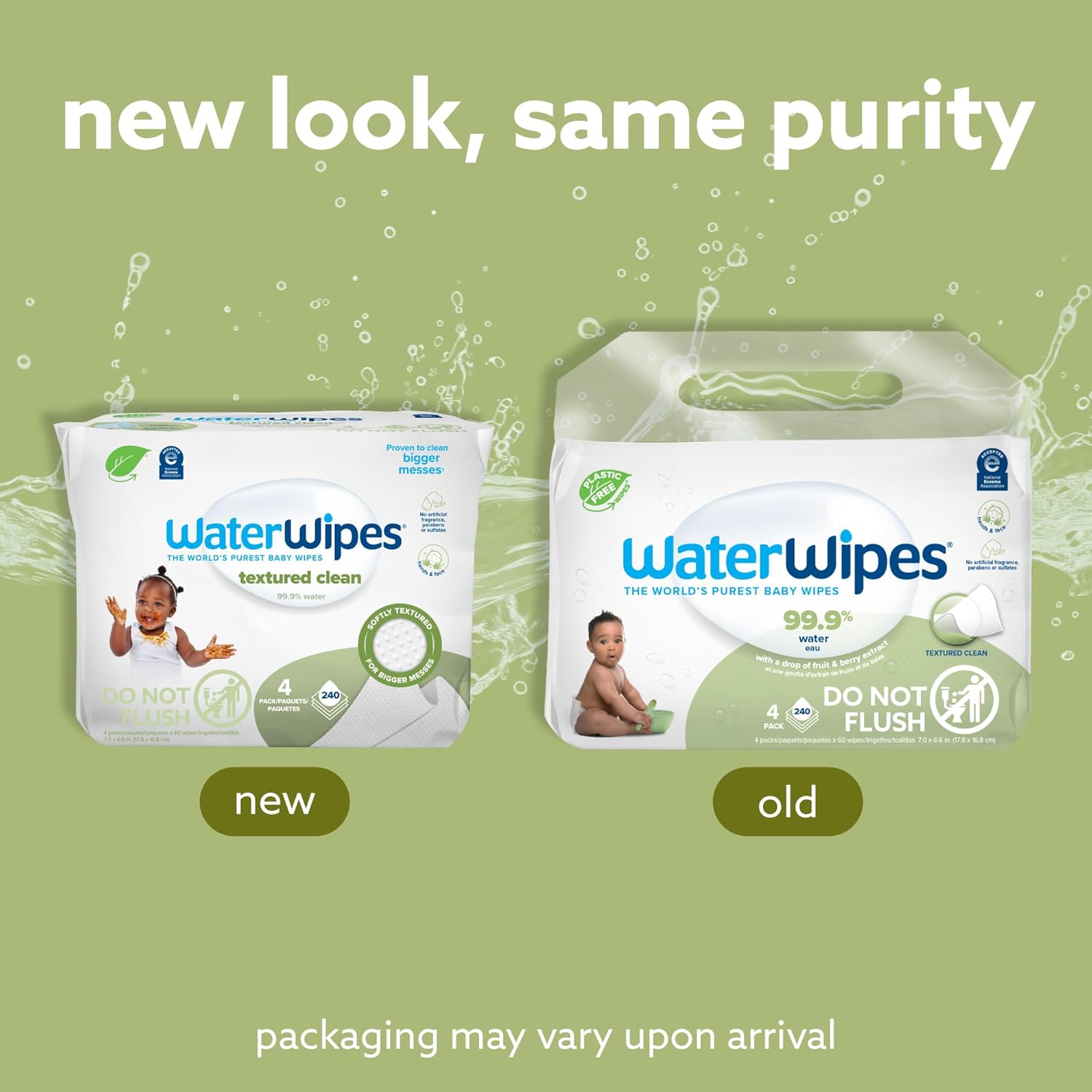 Families can trust WaterWipes Textured Clean 240 count (4 packs) to gently clean and help protect sensitive skin. Our new Plastic-Free Textured Clean toddler and baby wipes are the same formula and purity as before, with just 3 ingredients: 99.9% ultra-purified water and a drop of fruit and berry extract to naturally cleanse the skin.