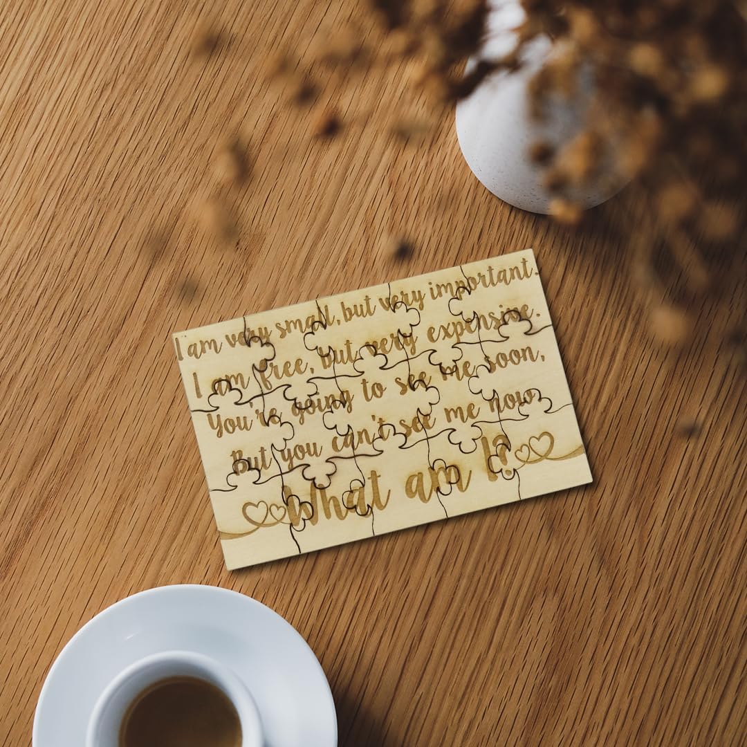 Puzzle is made of 1/8″ thick basswood. Due to it being a natural wood, grain color will vary on each piece. Laser engraved by FashionJunkie4Life and puzzle pieces can be glued together for a keepsake. Write all the details on the back with a permanent marker. Arrives in a gift box