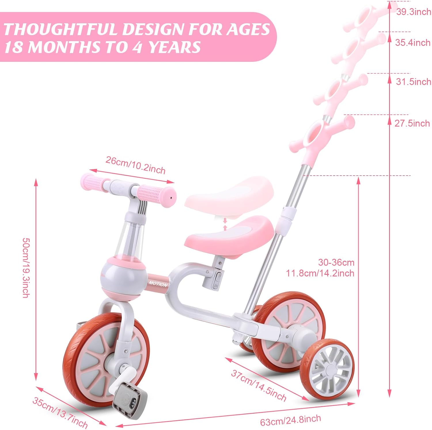 XIAPIA Kids Tricycles for 2-4 Years Old Girls with Detachable Pedal and Training Wheels, Push Bike for Toddlers 1-3, Riding Trikes Toys with Adjustable Push Handle, Birthday Gifts for Kids
