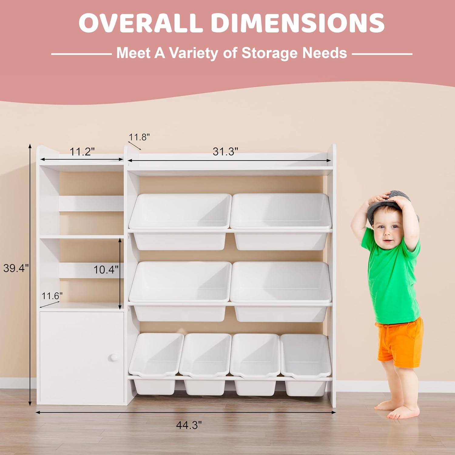 Multi-Functional Storage Solution – Our kids toy organizer is made of sturdy wood and includes 2 open book shelves, 1 storage cabinet, and 8 colorful toy boxes. With its large capacity, it can store approximately 50-80 toys and 30-50 books, providing the perfect storage space for your child.