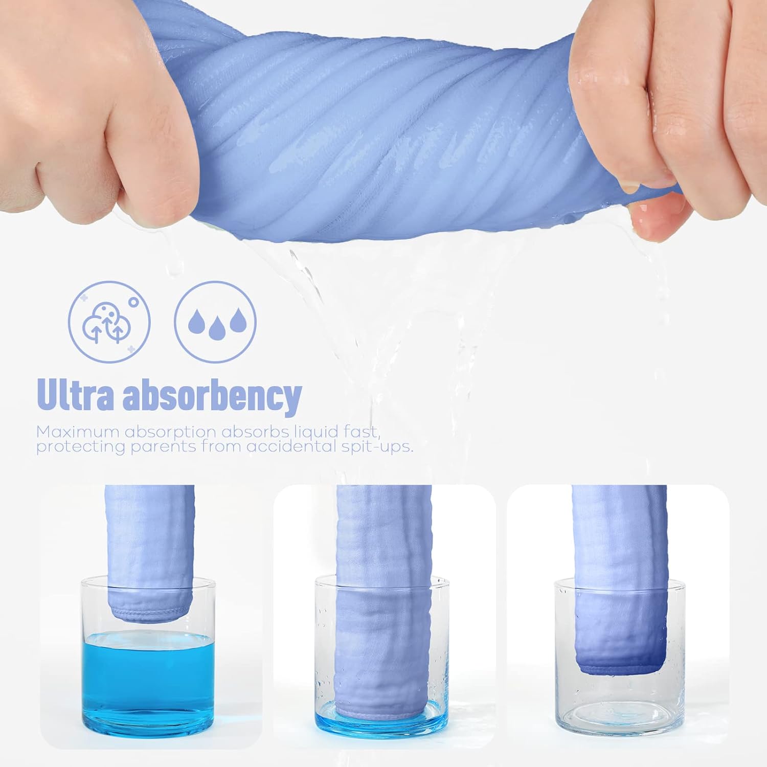 SOFT AND ABSORBENT: The fluffy structure of muslin burp cloths provides a comfortable and breathable effect. Large 20”X10” size offers maximum coverage, absorbs drools and spills in seconds, keeping cloths dry and comfy.