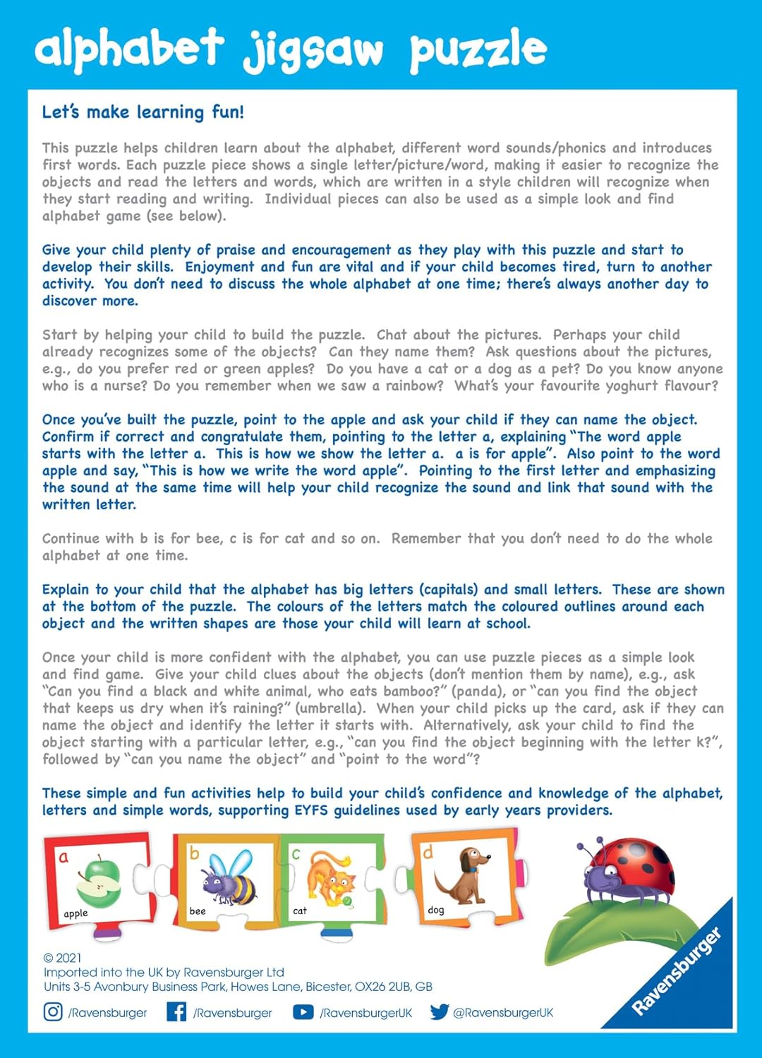 There’s so much to enjoy on this bright and colourful alphabet puzzle! Each piece shows an animal, person or item most children will recognise, and the simple layout makes it easier to associate the objects with their starting letter or word. Letters and words are in a style that children will recognize when they start nursery or school, and each object is phonetically correct, helping children to “”hear”” each individual starting letter/sound. Puzzle can also be used as a simple “”look and find”” game. Comes with leaflet giving ideas for play. Supports Early Years Foundation Syllabus guidelines and helps to build your child’s confidence and knowledge. Our 30 piece kids puzzles are crafted with premium quality and measure 36 x 26cm when complete. Great puzzles for Children 3 years old and up. Bestselling puzzle brand worldwide – With over 1 billion puzzles sold, our children’s jigsaw puzzles make ideal gifts for boys and great gifts for girls. Perfect toys for your child – Puzzles for kids of every age help support a child’s development as they play, building skills such as concentration and creativity. Positively Puzzling – From fun family times together to long term health benefits and day-to-day mindful moments, there are so many positives about the humble Jigsaw! They make a great birthday gift or smashing Christmas gift