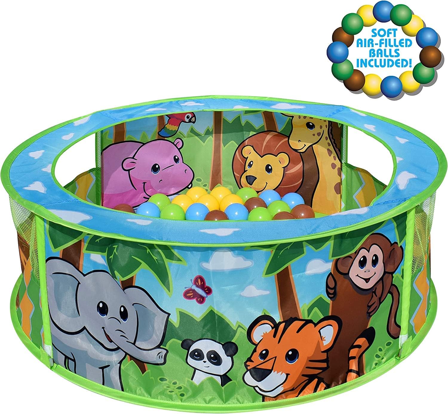 Kids can get all of the fun and playful action of a ball pit right in the middle of the living room or backyard with the Sunny days animal-themed ball pit. This adorable ball pit is big enough for multiple children to play together. It comes with 20 soft, air-filled balls. The pop-up design is great for easy assembly and fast, condensed storage.Established in 2012, Sunny Days Entertainment, LLC is comprised of a core group of toy industry veterans with the mission of spreading sunshine through traditional, creative play. Our focus is to enhance the experience for consumers in order to expand children’s imaginations and encourage them to unplug and play. At Sunny Days, each toy is designed with safety in mind. All of our toys are thoroughly tested to meet the highest standards possible. We stand by our superior quality and want to ensure complete satisfaction. If you experience any trouble, please reach out to our team so we can make it right.